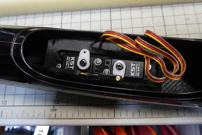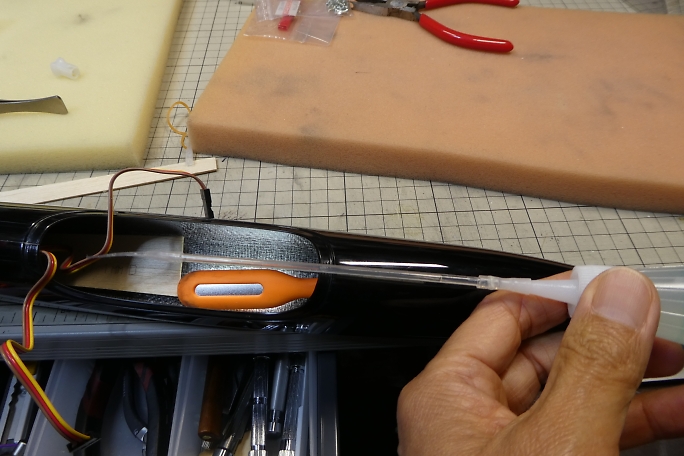 ![]() 胴体後部からロッドを挿入します。 片側が中々入らなかったので、ピアノ線をリードに使って引き込みました。 ![]() この位置は正規の接着位置と180°ひっくり返った位置です。 この状態でサーボにロッドを取り付けます。 捻れた 状態なので、ロッドの位置に注意します。 ![]() ロッドの取り付けられたサーボベッドを180°ひっくり返しました。 これが正規の取り付け方向です。 ![]() 胴体底部にクレビスが接触しないように1ミリのスクラップバルサを差し込んで位置決めを行います。 ![]() カンザシホールから接着剤を薙がせる範囲に低粘度瞬間接着剤を流して接着します。 ![]() 前側からはお馴染み、ロングノズルを使って接着剤を流します。 低粘度瞬間接着剤を使用します。 |