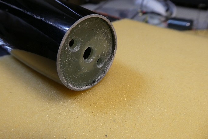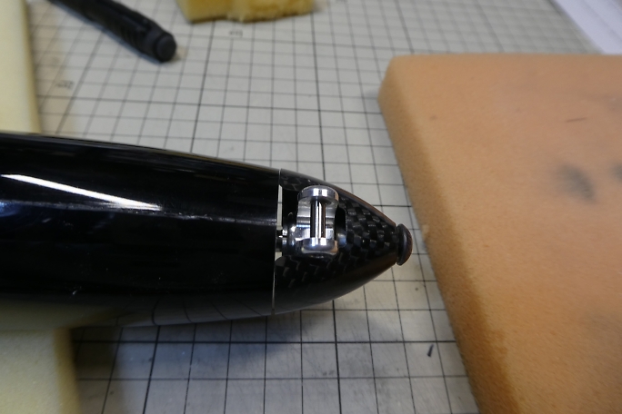 ![]() モーターを仮組みしたところ、寸法的には入るはずのモーターが入りません。 胴体の合わせ目部分の盛り上がりが引っかかるようです。 ![]() 盛り上がりをリューターで削ります。 2.4GHz対策で、ノーズ部分はFRPとなっています。 ![]() モーターが入る様になりました。 ![]() モーターとマウントを組み付けた状態で、スピンナーを取り付け、角度などのずれを確認します。 ![]() モーターが動かないようにそっとスピンナーを外し、モーターマウントの3カ所だけ瞬間接着剤を点付けして仮止め します。 再度スピンナーとのアライメントを確認したら、一度モーターを取り外します。 ![]() モーターマウントの外周全周に低粘度瞬間接着剤を流して接着します。 |