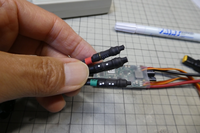![]() ESCのコネクタはリバースタイプに取り付けます。 ハンダ付けがし易いように、0.28ミリの銅線で縛ってから ハンダ付けをします。 ![]() ハンダ付けが完了しました。 縛った時のヒゲを切り落とし、シュリンクチューブで保護しておきます。 ![]() ![]() サーボテスターを使用して回転方向を確認します。 バラした時にわからなくならないように、合いマークを入れて おきます。 ![]() モーターとESCを取り付けます。 |