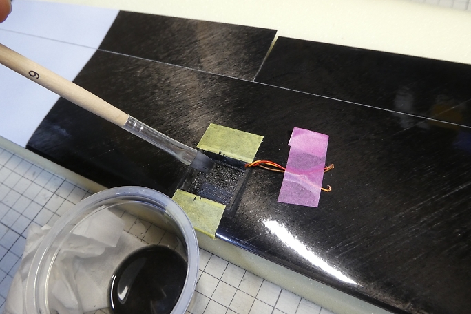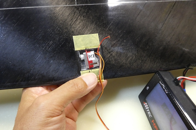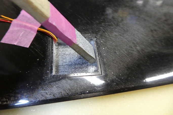 ![]() サーボを仮入れしてみました。 サーボホーンがスパー寄りに向く方向に納めるのがリンケージロッドの角度が深くなり、 取り出し穴を延長する必要も無いようです。 ![]() コアにサーボホーンの耳が収まるポケットを加工します。 ![]() ![]() サーボホールのサーボ取り付け面と側面をサンディングして平滑にします。 ザックリと切りとってあるだけなので、 側面などボロボロでした。 サーボホールの剥き出しのコアを補強して、サーボの取り付けを確実にするために5052にカーボンパウダーを混ぜた 物を塗っておきます。 |