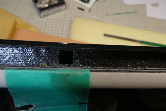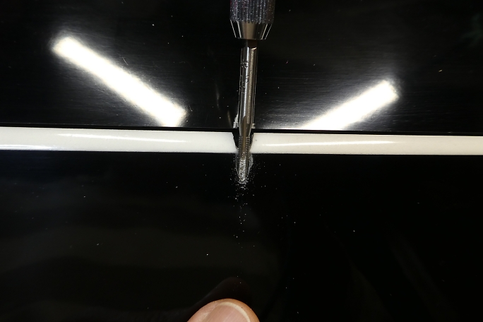![]() 後縁材にメーカーが開けてきたロッドの取り出し穴です。 横長に開いていますが、ピアノ線のロッドを入れるだけなので どうせ開けるなら縦長の穴にして欲しかったです。 ![]() 幅はそのままに、縦に長く加工します。 ![]() クレビスの取り出し部を幅6ミリ、長さ10ミリのサイズで加工します。 ![]() 超音波カッターで少し小さめにスキンを切り取ります。 ![]() ヤスリを使って形を整えます。 ![]() 棒ヤスリにギャップシールを削ってしまわないようにマスキングテープで養生をして、出口付近の裏側をスムーズに 整形します。 樹脂クレビスを仮組みしました。 サイズも丁度良かったみたいです。 |