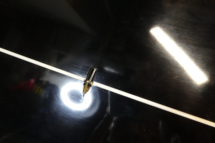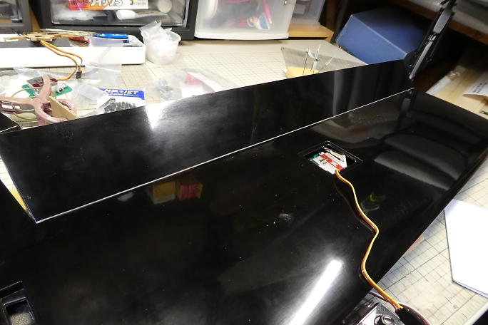 ![]() フラップをニュートラルに合わせた状態で固定します。 この機体では胴体付近に固定部分があるので、ニュートラル が合わせやすくて助かります。 フラップとサーボをロッドで接続して、サーボのニュートラルを180μs分オフセットした状態とフラップのニュートラルが 合う位置で軽く手でサーボを押さえて、サーボベッドの四隅のみ一滴の中粘度瞬間接着剤で仮固定します。 瞬間接着剤を滴下したら、直ぐに硬化促進剤で接着剤を硬化させます。 そのまま放置すると、瞬間接着剤がロハセルまで染みこんで表面に歪みを作ってしまうからです。 硬化促進剤は白化がほとんど無いボブスミスの硬化促進剤を使用しています。 ![]() 動作確認をして問題が無ければ、サーボベッドの全周に中粘度瞬間接着剤を流して本接着とします。 接着剤を流した後は直ぐに硬化促進剤で接着剤を硬化させます。 ![]() ブレーキ舵角も充分に取れています。 ![]() 表側この様になりました。 クレビスとリンケージ取り出し口に大きな隙間を作らずに済みました。 |