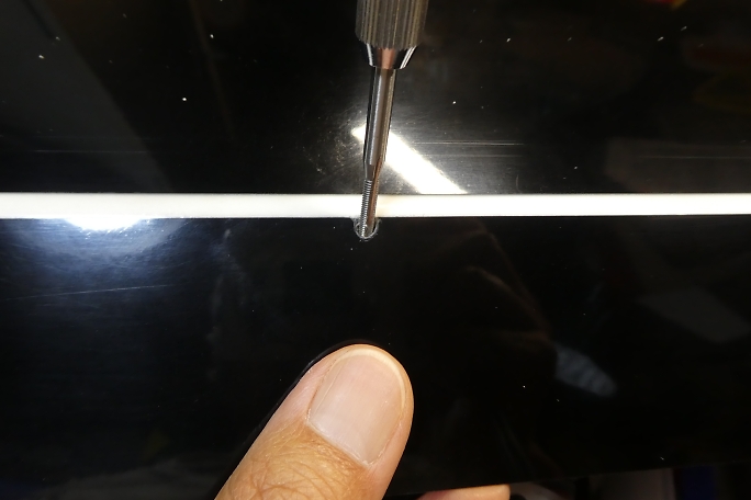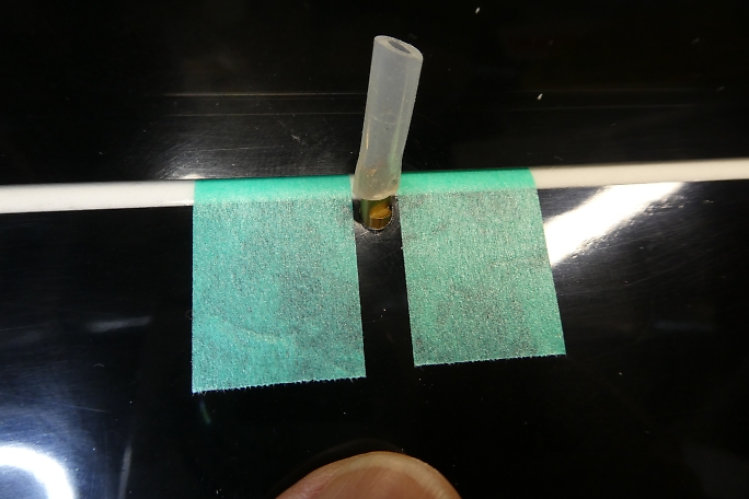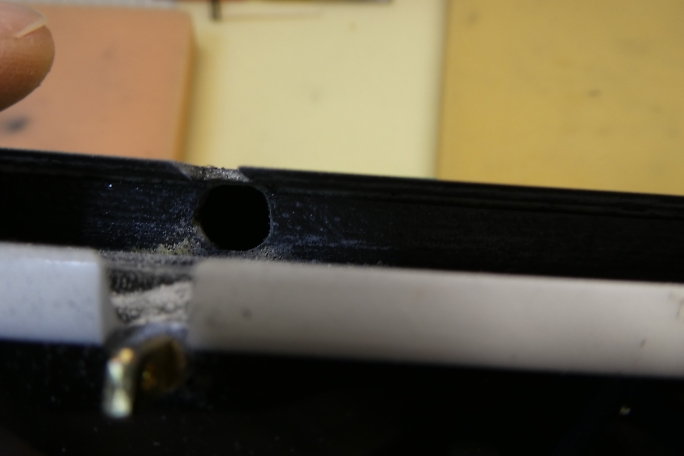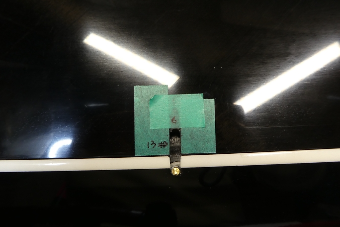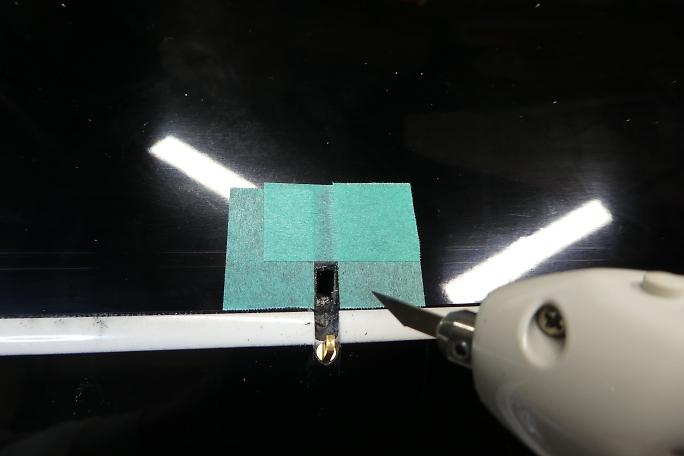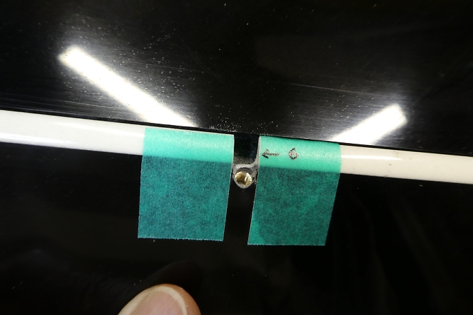 ![]() エルロンホーンの受けになるインサートナットも樹脂やら離型剤やらが入り込んでいるので、M3のタップで軽くさらって おきます。 ![]() ブラスホーンの首が入る様に4ミリのドリルでインサートナットまでの道を広げておきます。 ![]() 右が付属のブラスホーンですが、ホーンの高さを抑えたかったので手持ちの左のブラスホーンを使用しました。 ホーンが高いと、リンケージ取り出し口を長く開ける必要がで出来てしまうためです。 ![]() ブラスホーンのネジ部が長いので、リューターの切削砥石でカットします。 ![]() カットしたら切り口の面取りも忘れずに行いましょう。 ![]() ここまでホーンが沈みます。 ![]() ![]() クレビスの幅をマスキングテープでマーキングします。 6ミリ程切り欠けば良さそうです。 ![]() クレビスが無理なく動くように加工しました。 ![]() 作業中には何度もブラスホーンを付けたり外したりしますが、指が痛くなってしまうので、シリコンチューブを被せて 回すと取り外しが楽になります。 ![]() 超音波カッターで表皮を切り開きます。 仮にフラップと同様のサイズで切ってみます。 エルロンホーン部の方が 翼厚が薄く、リンケージの角度が浅くなるために長めになる予想です。 ![]() 切り取り面の整形を済ませました。 ![]() 貫通孔はフラップ同様に横長の穴が開いていました。 ![]() エルロンではフラップほどのトラベルは必要無いので丸穴に整形しました。 ![]() 引っかかり具合を調整した結果、取り出し穴の長さは13ミリとなりました。 |