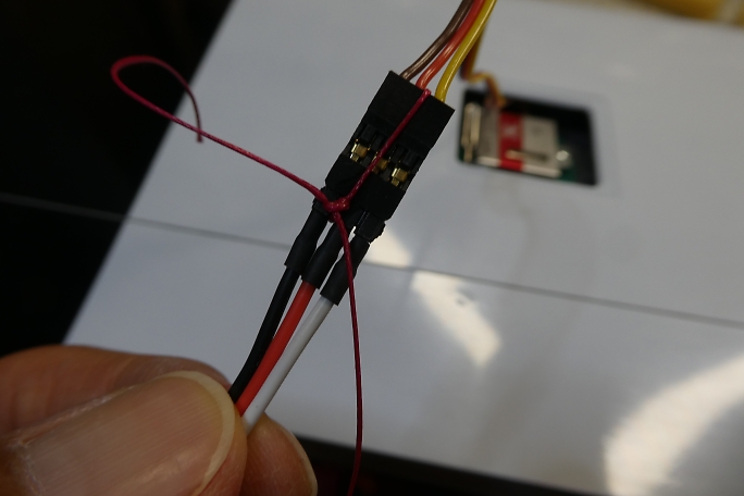 フラップサーボ、エルロンサーボのサーボコードと延長コネクタはPEラインで縛って抜け止めとします。