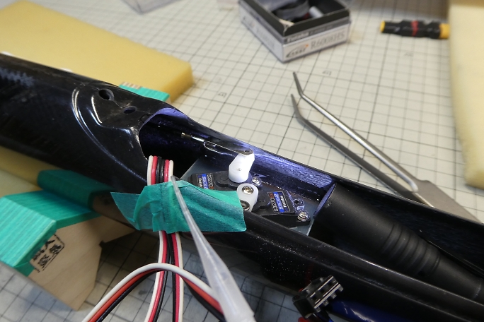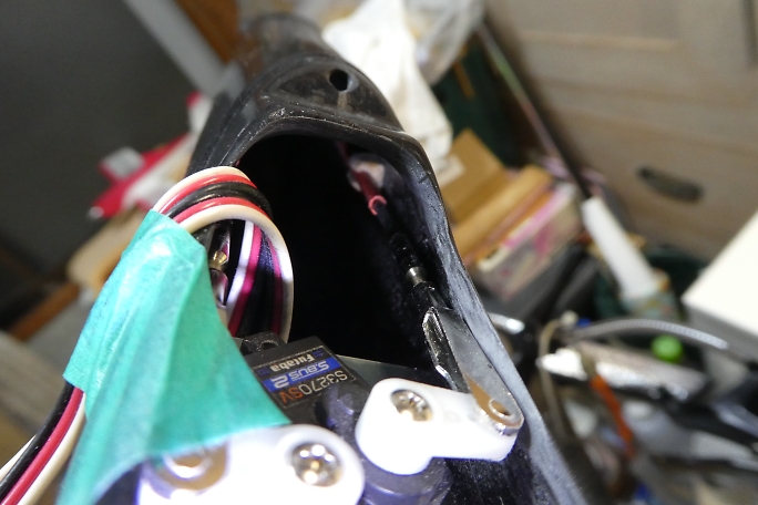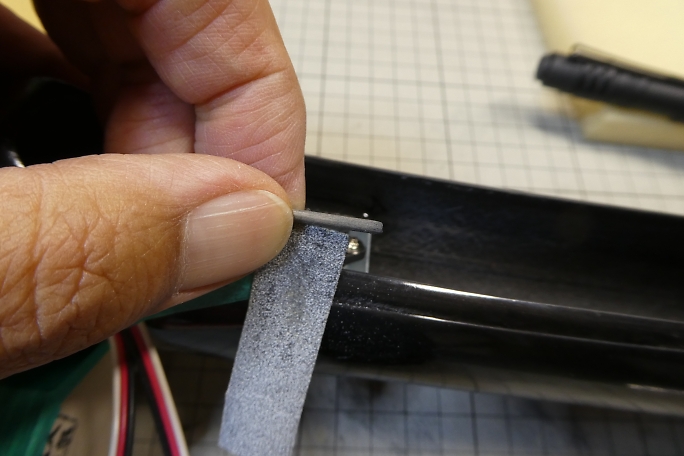 ![]() 簡易ニュートラル出しツールでラダーのニュートラルを出します。 ![]() ラダーサーボを1520μsのニュートラルで合わせて、リンケージロッドのカット位置をマーキングします。 リンケージの 接合部が奥まってしまうので、一度ラダーからリンケージを外してロッドを引き出してリューターの切削砥石でカットします。 ![]() カットしたロッドの接着部をサンディングしておきます。 ![]() 低粘度瞬間接着剤でリンケージロッドとロッドエンドを接着します。 暗いのでLEDライトで照らしながらの作業になりました。 |