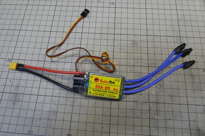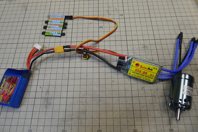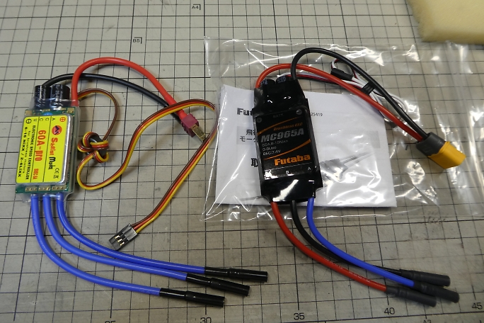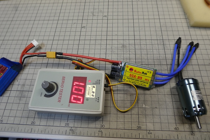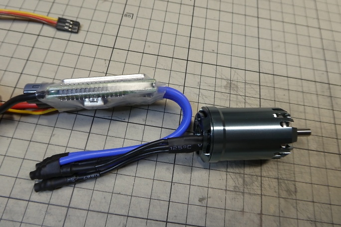 ![]() ESCは左のSunriseの60Aの物を使用します。 ![]() モーターコネクタは取り付け済みになっていますが、リバースタイプにするために元のコネクタを切り取り、新たにコネクタ をハンダ付けします。 ハンダ付けの前に、0.28ミリの銅線で縛って仮固定をしておきます。 ![]() フラックスを塗ってハンダ付けをします。 ![]() 入力側をXT30コネクタに付け替え、モーターコネクタはシュリンクチューブを掛けて保護をしておきます。 ![]() 胴体内でのモーターとESCの位置関係です。 ![]() セッティングカードを使用して、ブレーキ設定をします。 ダイレクトドライブなのでブレーキはハードを選択します。 ![]() サーボテスターを使用して低速でモーターを回し、シャフトを指で軽く触れて回転方向を確認します。 ![]() モーターの回転方向が判ったら、モーターコネクタに合いマーク入れておきます。 |