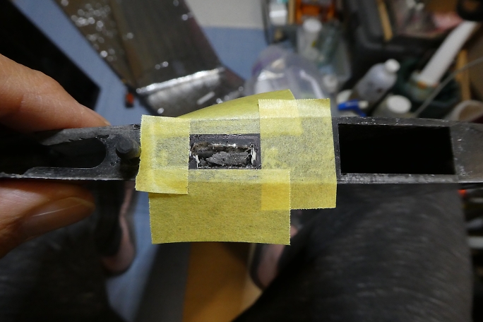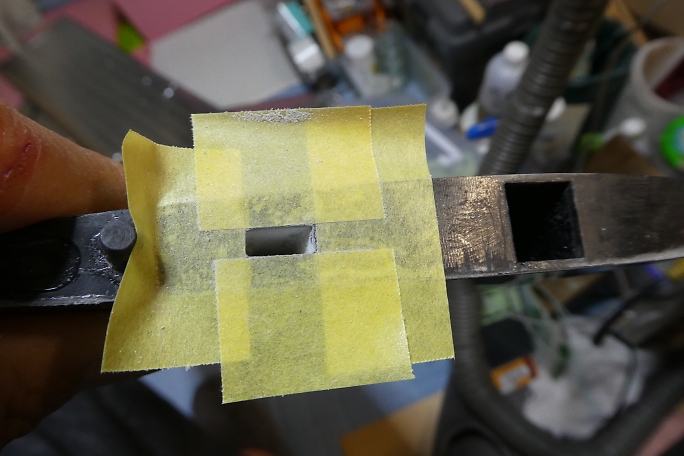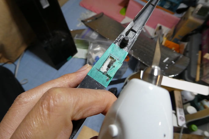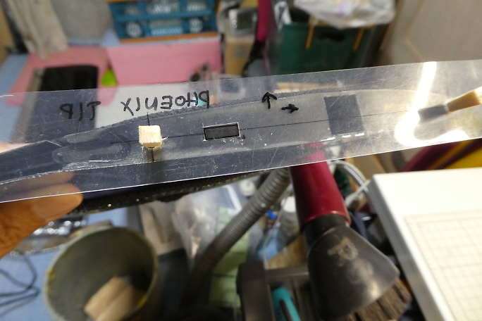 ![]() コードの下穴らしき物から、胴体側の開通位置を予想して小さな穴を開けてみる事にしました。 下穴らしき物とヒンジライン 平行に行った先の胴体側端面に予想位置をマーキングし、小さな穴を開けてみます。 ![]() サーボホールにLEDライトを入れて、光を送ってみます。 ![]() 予想位置に光の漏れが確認出来たので、この位置で作業を進める事にします。 ![]() ![]() キットに付属していた胴体−主翼連結用コネクタです。 立派な物ですが、胴体、主翼共にかなり大きな穴を開ける必要 があります。 ![]() せっかくの添付品ですが、二回り以上小さなMPXコネクタを使用することにします。 ![]() MPXコネクタのサイズに合わせて、端面を超音波カッターで切り取ります。 下穴位置にそのまま開けてしまうと、 アライメントピンに近すぎて、アライメントピンの強度が心配になったので、カンザシ側に5ミリ寄せて穴を開けます。 ![]() 下穴位置、MPXコネクタサイズに開けた胴体側端面の穴を元にコネクタ位置を示すテンプレートを作製しました。 ![]() テンプレートに従ってカット位置をマーキングします。 ![]() マーキングを元に、周囲をマスキングテープで養生します。 ![]() 実際のMPXコネクタより1ミリ大きく、コネクタにハンダ付けしたコード束のサイズをイメージして彫り込みます。 ![]() 外翼側もテンプレートを使用してカットする位置をマーキングします。 ![]() ![]() カット位置をマスキングテープで養生して切り開きます。 ![]() 使用するコネクタハウジングがピッタリ収まるサイズに加工します。 |