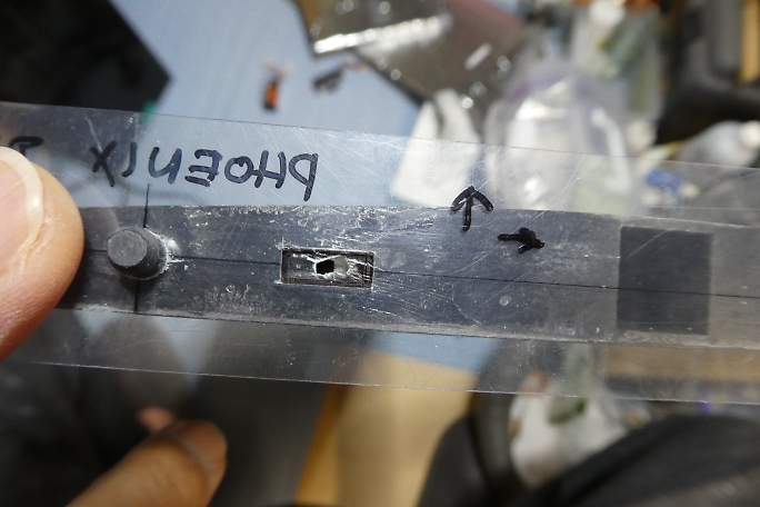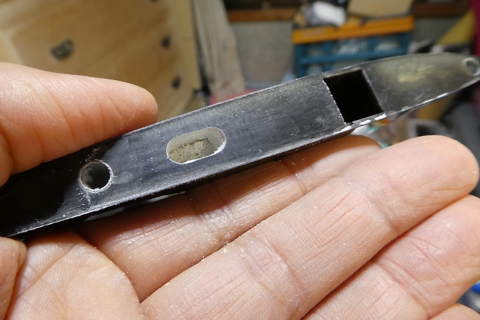 ![]() ![]() ![]() 外翼側もセンター翼の外翼側で使った物とと同じテンプレートを使用してコネクタホールを加工します。 こちらはフリーに なる方なので、大きく穴を広げておきます。 |