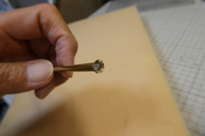 ![]() コードホールの下穴はとても通常の26AWG程度のコードが入るサイズでは無いので、広げる必要があります。 5ミリの真鍮パイプに先に刃を付けて、コードホールを広げるツールにします。 ![]() ツールを回転させながら、角度や方向に注意して、端面からサーボホールまで貫通させます。 |