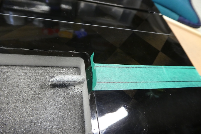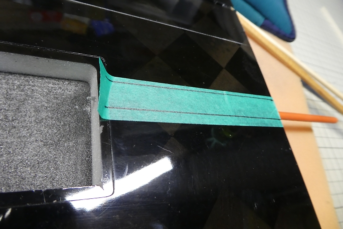![]() 外翼側は下穴すら開いていませんので、テンプレートを使って加工したコネクタホールから真っ直ぐにサーボホールに 伸びるように加工します。 イメージラインをマスキングテープに書き込みました。 ![]() 棒ヤスリで少しずつ彫り進んで行きます。 ヒノキ棒をガイドにして、曲がらないように加工します。 ![]() 貫通しました。 ![]() 棒ヤスリで開けた穴を下穴にして、棒ヤスリに細く切ったサンドペーパーを巻き付けてコードホールを広げて行きます。 |