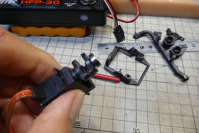 ![]() なぜか座りが悪いので良く見たところ、サーボベッド下面からサーボホーンがはみ出ていました。 ![]() サーボホーンの外周を削って調整します。 ![]() サーボホーンは一番小さい物しか使用しないので、フラップ、エルロンサーボともに準備しておけます。 全サーボ共にサーボホーンの修正は必要でした。 |
