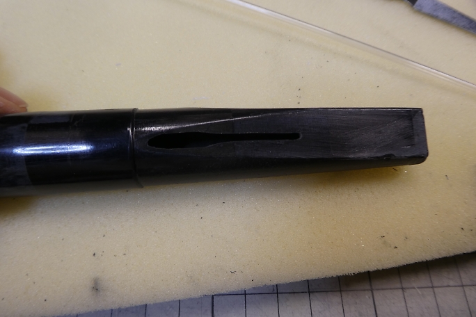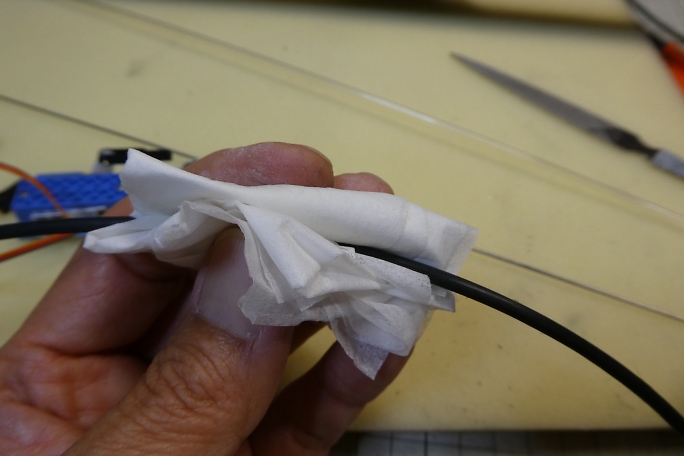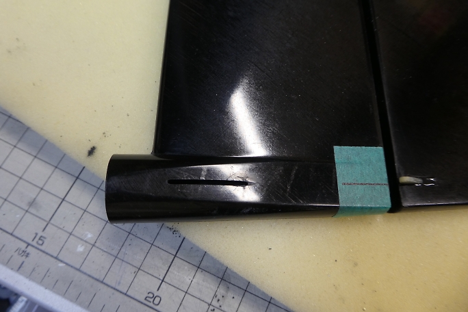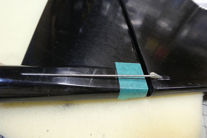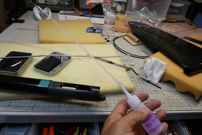 ![]() アウターチューブの表面をサンドペーパーでサンディングして足付けをしておきます。 ![]() チューブの表面を硬化促進剤で拭いておきます。 硬化促進剤はロックタイトの712を使用します。 ![]() 胴体後端に開けたラダーリンケージ用の穴にピアノ線を通したアウターチューブを通し、その位置と事前にマーキングした サーボホーン位置を結ぶようにマグネットでロッドを固定します。 ![]() ロングノズルを取り付けた低粘度瞬間接着剤でチューブに沿うように瞬間接着剤を10滴ほど流し、直ぐにエアダスターを 一吹きして接着剤を行き渡らせます。 ハンドランチでやっているのとほぼ同じ工程です。 ![]() ラダーリンケージ取り出し口はアウターチューブを胴体にツライチになるように整形します。 |