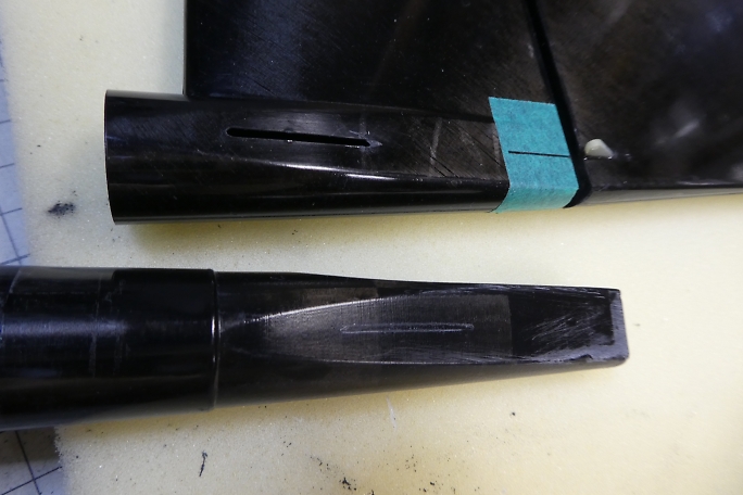 ![]() リンケージパイプを敷設するにあたって、サーボベッドを仮固定して、サーボホーンの穴位置からロッドの通るラインを 予測してマーキングをします。 ![]() 短いピアノ線を使って、ラダーリンケージの通るラインの穴開けをします。 ![]() 少しリンケージの動きに余裕が出る様に前後方向の穴の長さを加減します。 リンケージの抜け防止の意味もあるので、 上下方向はピアノ線の太さギリギリにしてあります。 ![]() 垂直尾翼の穴位置を胴体側に転写します。 ![]() リンケージのピアノ線と、アウチーチューブの分も含めて加工しました。 |