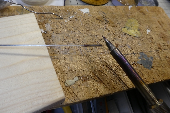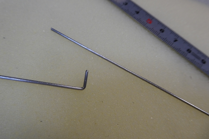 エレベーター、ラダーリンケージ共に動翼側は先端を90°に曲げて、更に丸め加工をしておきます。 ![]() 今回はアウターチューブに余裕があり、ロッドエンドが通るサイズです。 ですので、ロッドエンドはロッドにハンダ付けを してからリンケージをする事ができました。 長さを決めて切断したロッドの先端を良くサンディングして磨いてから、ステンレス用のフラックスとハンダでハンダ付けを します。 ![]() 完成したラダーリンケージです。 ホーンからリンケージを外し、垂直尾翼を抜きながら少しひねるとリンケージを垂直尾翼 から抜き取る事が出来ます。 ![]() 完成したエレベーターリンケージです。 |