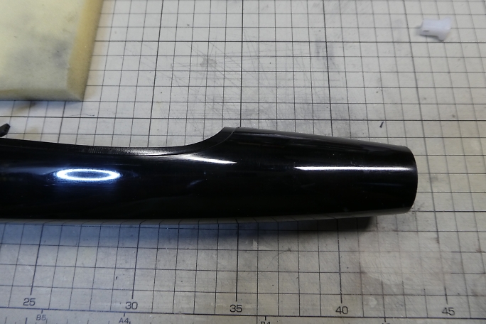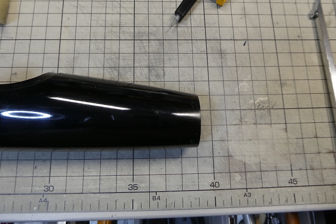 ノーズ部分は適当に切られているようで、かなりしゃくれていました。 ![]() ボール紙に30ミリの穴をあけたテンプレートを作り、スラスト角を胴体の中心線に合う様にノーズを切断しました。 ![]() 切断、整形の終わったノーズ部です。 |