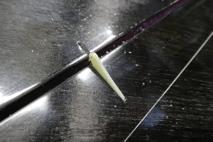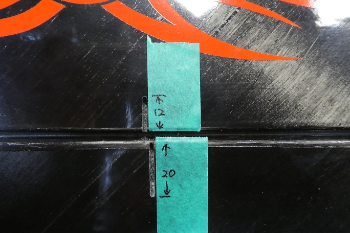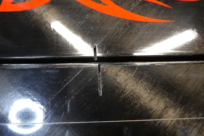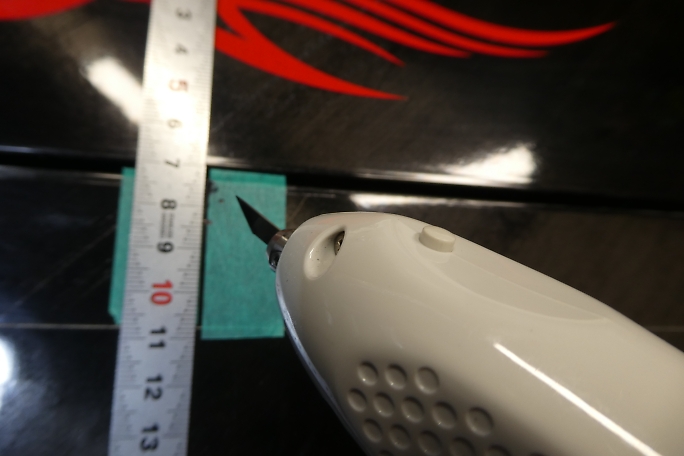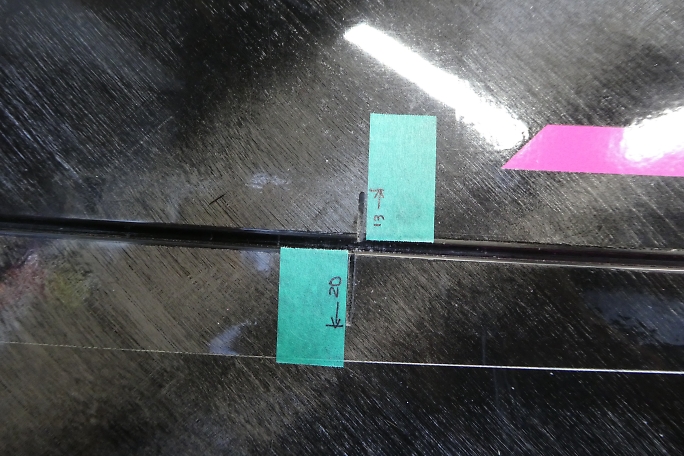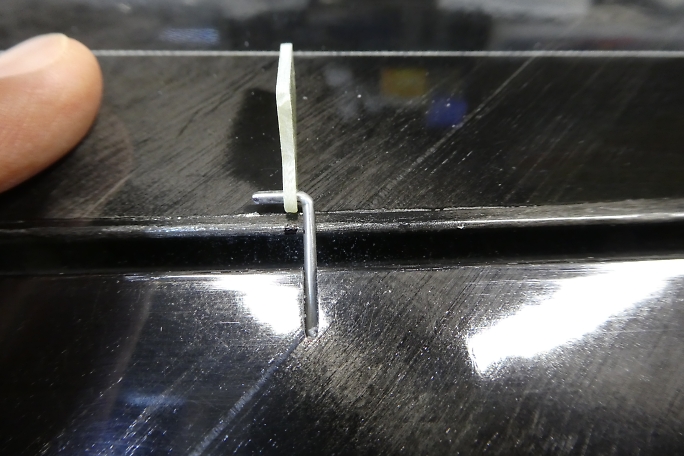 ロッドとホーンを組合せ、ホーンをロッドの曲がり部分ギリギリまで寄せた状態でフラップにホーンの取り付け位置を マーキングします。 ![]() ピンぼけですいません。 超音波カッターでフラップの表皮を切り取ります。 角部分はロービングで固くなっているので 力を入れすぎで刃を貫通させないように注意します。 ![]() 表皮を切り取ったら、ホーンがキュッと入る程度に整形し、中のコアを下面のスキン裏側まで掻き出します。 ![]() ![]() ホーンを取り付けて、アップ側にしたときの主翼とのクリアランス等を確認しておきます。 ![]() ロッドを取り付けて、ロッドの動きも確認しておきます。 ![]() 最終的に、フラップ側はホーンの切り込みが12ミリ、フラップホーン用の切れ込みが20ミリで落ち着きました。 |