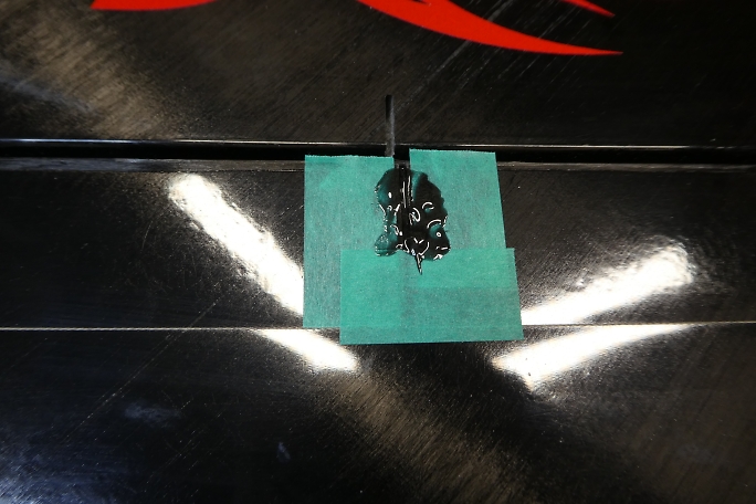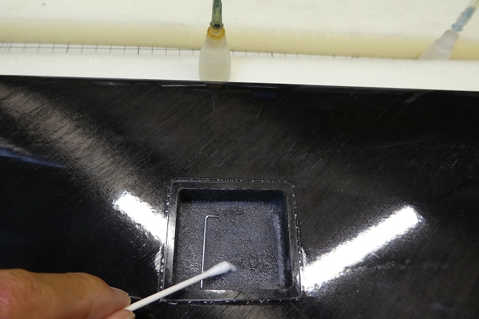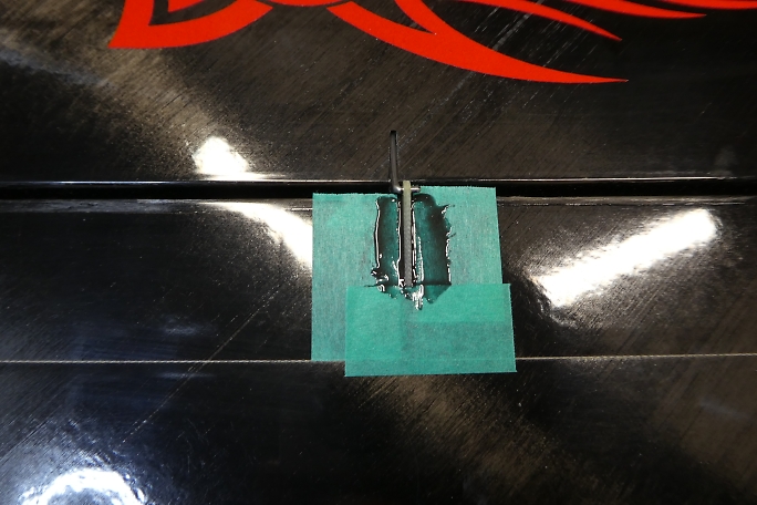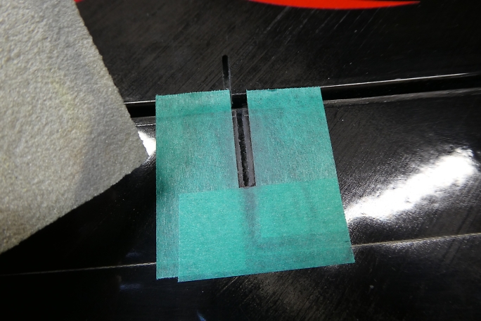 ![]() フラップホーンのスロットから2ミリ離した所にマスキングテープを貼って養生をして、スロットの周囲をサンディングして 足付けをしておきます。 この部分にカーボンパウダー入り5分エポキシが乗り、僅かではありますが補強となります。 ![]() フラップホーンの接着部も表面をサンディングして足付けをしておきます。 ![]() マスキングテープの幅をスロットから1みりまで狭めて、スロットの中にカーボンパウダー入り5分エポキシを充填します。 ハードポイントにもなりますので、内壁にしっかりと塗りつけます。 ![]() はみ出で来るカーボンパウダー入り5分エポキシを取り除きながら、リンケージロッドを取り付けた状態のフラップホーン をスロットに沈めます。 タイトに組み付けているので、リンケージロッドは後からでは取り付けが出来ません。 ![]() 位置が決まったら、カーボンパウダー入り5分エポキシが硬化する前、直ぐにマスキングテープを剥がしておきます。 硬化が始まってからマスキングテープを剥がすと、テープとの段差が残ったり、マスキングテープにエポキシが 引っ張られてしまったりしてしまうからです。 直ぐにマスキングテープを剥がすと、エポキシが僅かに流れて、段差が少なくなります。 |