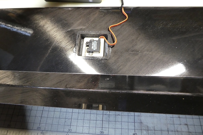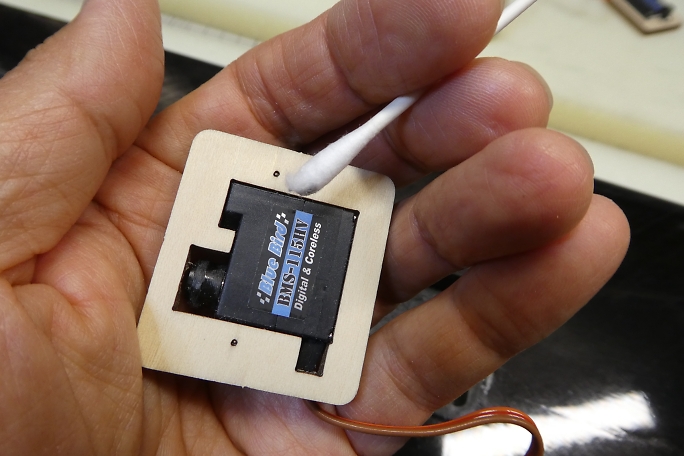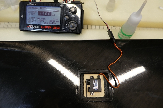 ![]() サーボホールの接着面を硬化促進剤で拭いておきます。 硬化促進剤はロックタイトの712を使用しました。 ![]() サーボベッドの接着面も硬化促進剤で拭いておきます。 こちらもロックタイトの712を使用します。 ![]() 200μs分サーボをオフセットした状態でフラップをニュートラルとします。 サーボの位置決めたら、中粘度瞬間接着剤 をサーボベッドの全周に流してサーボベッドを接着します。 中粘度瞬間接着剤を流し終わったら、硬化促進剤で硬化させます。 硬化促進剤はボブスミスを使用します。 ![]() 動作確認をします。 このDFシステムはサーボへの負荷が大きいので、リンケージのたわみ等、良く確認しておきます。 |