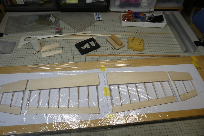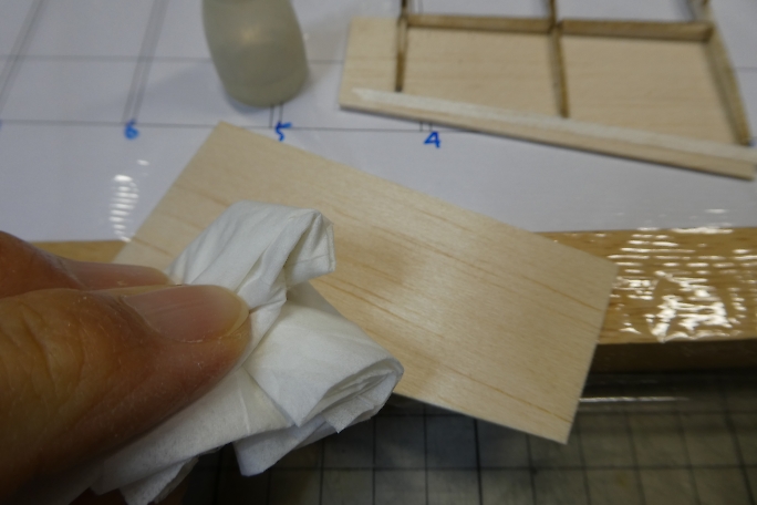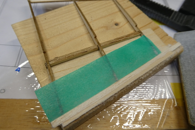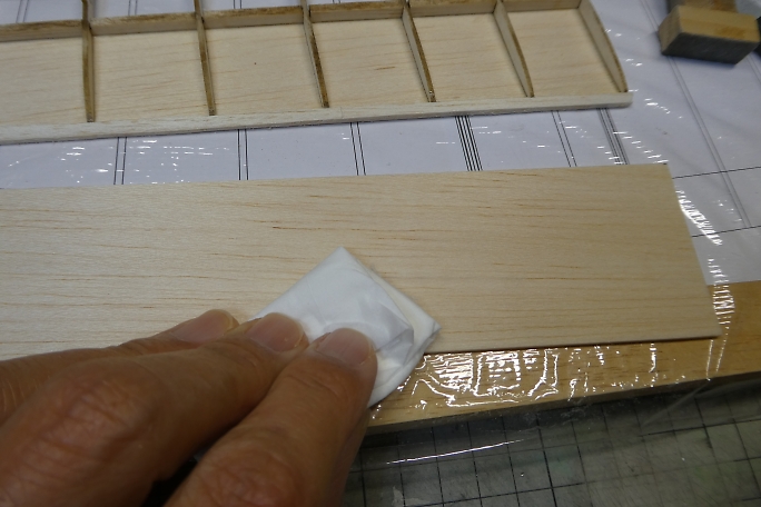 ![]() ![]() 外翼とチップ部のプランクが終わったので、軽く重しを掛けて一晩放置し、各部材を馴染ませます。 |