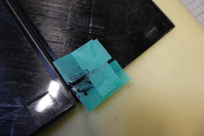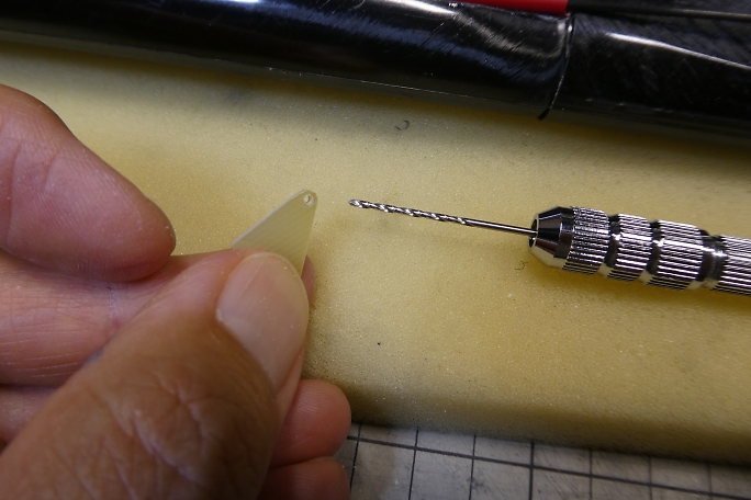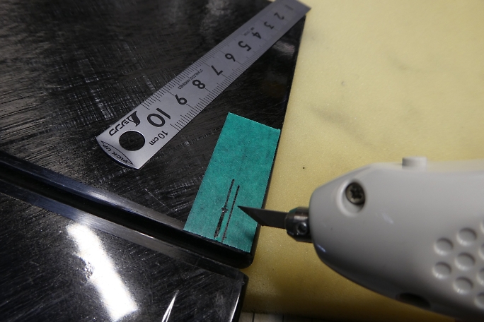 ![]() ![]() ラダーホーンを取り付ける為に、ラダーリンケージの位置をラダーにマスキングテープを貼った上に書き移します。 ![]() ラダーホーンのにはリンケージ穴が開けられていましたが、1ミリの穴だったので、1.2みりドリルで広げておきます。 |