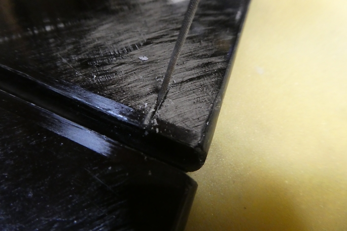 リンケージロッドの位置をマーキングして線の上側をラダーホーンの位置とします。 リンケージロッドのL字のロッド エンドをラダーホーンの下から差し込む為です。 表皮を超音波カッターで1.5ミリ幅で切り取ります。 ![]() 中のコアを反対側の表皮まで取り除き、ラダーホーンがスッと入るサイズまで整形します。 ![]() ラダーホーンスロットの周囲を1ミリ開けてマスキングテープで養生し、スロットの周囲をサンディングします。 この部分に もカーボンパウダー入り5分エポキシが乗り、補強となるからです。 ![]() ラダーホーンの接着部をサンディングして足付けをします。 反対側の表皮をキズ付けないように、角を落としておきました。 ![]() マスキングテープの幅をサンディングされたギリギリの所まで狭めて、ラダーホーンスロットにカーボンパウダー入り 5分エポキシを充填します。 反対側の表皮、スロットの側面にもカーボンパウダー入り5分エポキシが回る様にします。 ![]() はみ出してくるカーボンパウダー入り5分エポキシを取り除きながら、ラダーホーンを沈めます。 位置が決まったら、マスキングテープは直ぐに剥がしておきます。 ![]() ラダーホーンが取り付けられました。 |