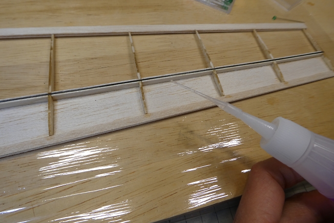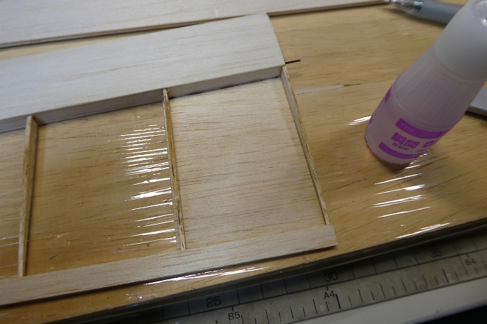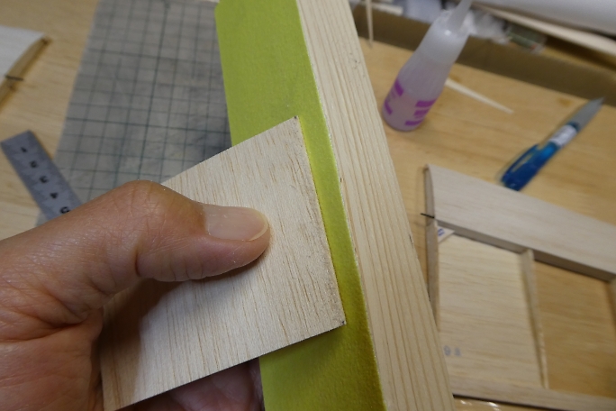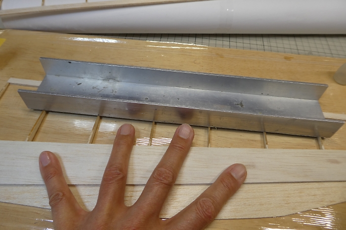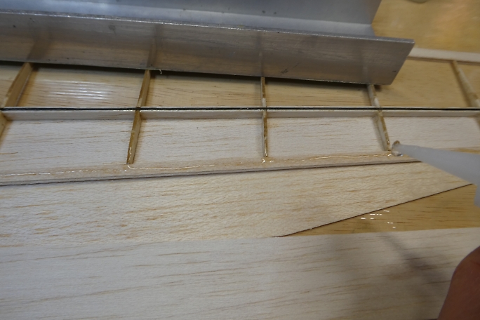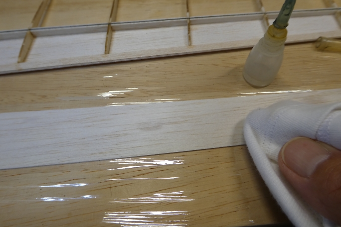 ![]() 上面プランクの準備として、リブなど縦目が出ているところに低粘度瞬間接着剤を流して硬化させ、この後の瞬間接着剤 の染み込み防止とします。 ![]() 接着を確実にする為に、上面プランク材の接着面を硬化促進剤で拭いておきます。 硬化促進剤はロックタイトの712 を使用しています。 ![]() リブ、スパー、前縁材に中粘度瞬間接着剤を盛り上げる様に塗布します。 事前に低粘度瞬間接着剤で染み込み防止 をしているので、直ぐには硬化が始まりません。 ![]() 後縁方向に重しを乗せ、前縁下には1ミリのスクラップバルサを敷いて主翼を安定した形にした状態で上面プランク材 を正しい位置に乗せ、両手でしっかりと押さえて密着させます。 そのまましばらく押さえて置けばしっかりと接着されます。 ![]() 上面プランクが終わったら、定盤の上で軽く重しを乗せ、一晩放置して馴染ませます。 以前、この工程をしないで、立てかけて置いたために主翼が捻れてしまった経験からの工程です。 |