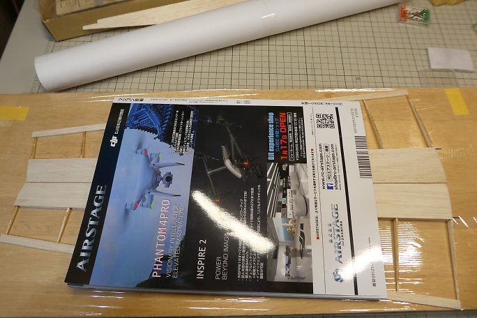 ![]() 後縁の上面プランクを接着します。 空中で接着をすると、捻れてしまう可能性があるので、定盤の上で、軽く重し (アルミのサンディングブロック)を乗せた状態で接着作業を行います。 |