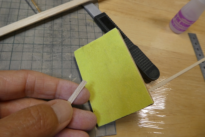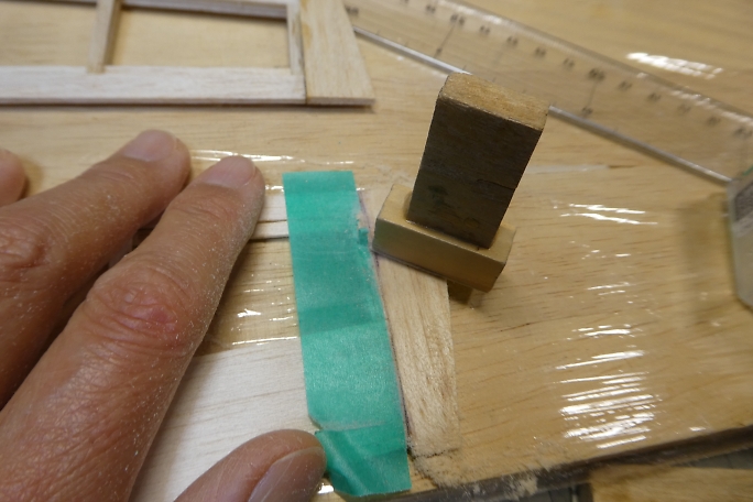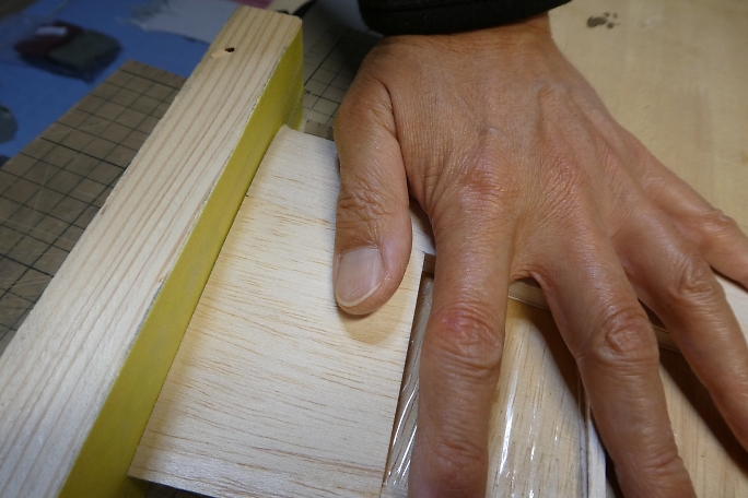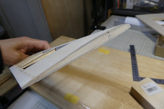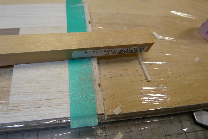 ![]() 中央材を荒削りします。 端面の翼型を中央材に書き移します。 中央材は上反角の角度が付けられていますので、 上下左右を間違えないように注意します。 ![]() 荒削りした状態で接着します。 ![]() 主翼側にマスキングテープで養生をして翼型に合わせて削ります。 写真の角材にはサンドペーパーが貼られて います。 ![]() マスキングテープを剥がして、マスキングテープの分の段差を修正していきます。 |