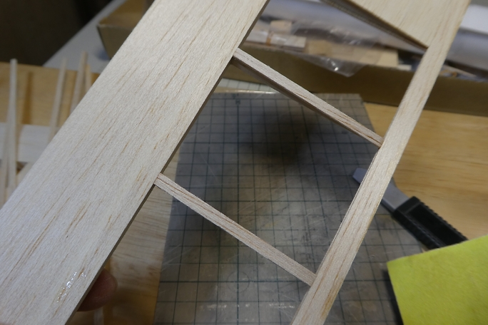 ![]() キット指示には無い一工夫です。 上面と下面の後縁プランクは>の様な状態になっていて、上下の間に隙間があります。 これをリブキャップ材と同じ 1ミリ×4ミリバルサを差し込んで接着、蓋をして上げる事で閉じた構造体となり、強度を上げることができます。 過去数機作ったムサシノのハンドランチグライダーで実施して実績があるものです。 ![]() 補強の終わった後縁です。 |