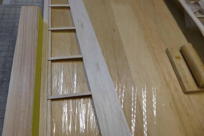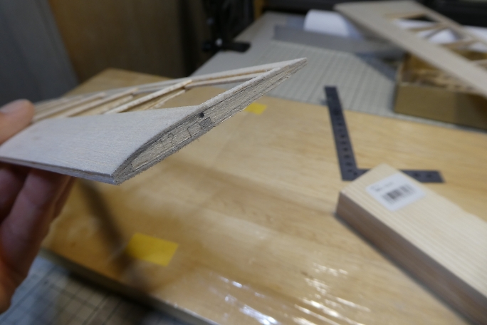 ![]() リブキャップを接着します。 リブキャップ幅は4ミリと狭くなっています。 リブキャップは重要な強度部材なので、角度や長さをキッチリと調整しておきます。 ![]() 下面から接着します。 隙間が出来ない様にします。 短くなってしまっても、外側のリブに回せますし、リブキャップ材 には余裕があるので、確実に作業をします。 ![]() 下面のリブキャップの接着が終わったら、軽く重しを掛けて一晩放置します。 ![]() 上面のリブキャップの下面同様にキッチリと仕上げます。 |