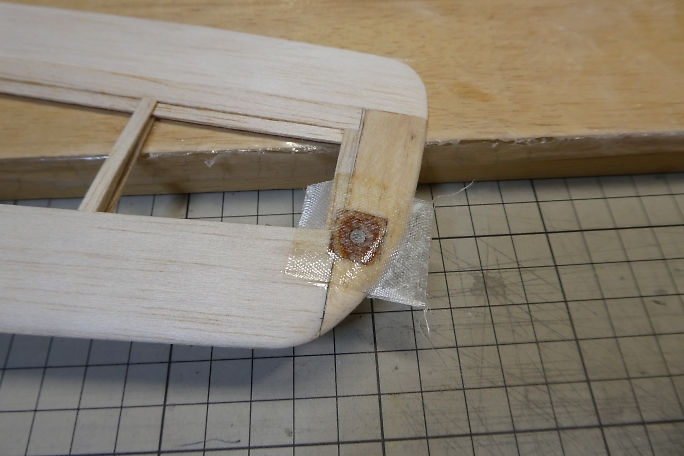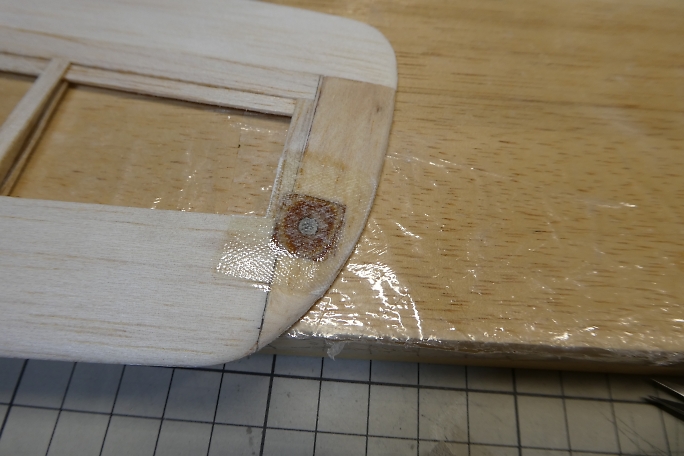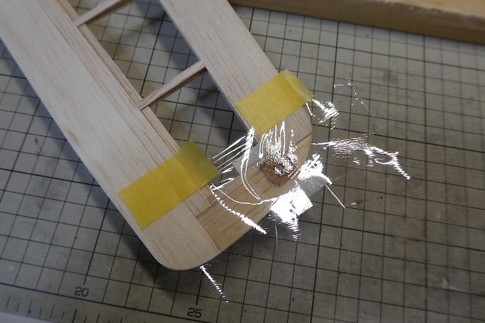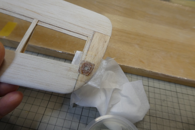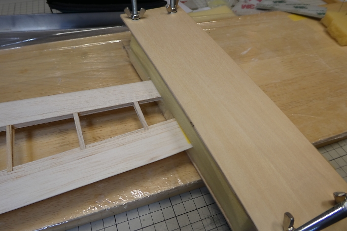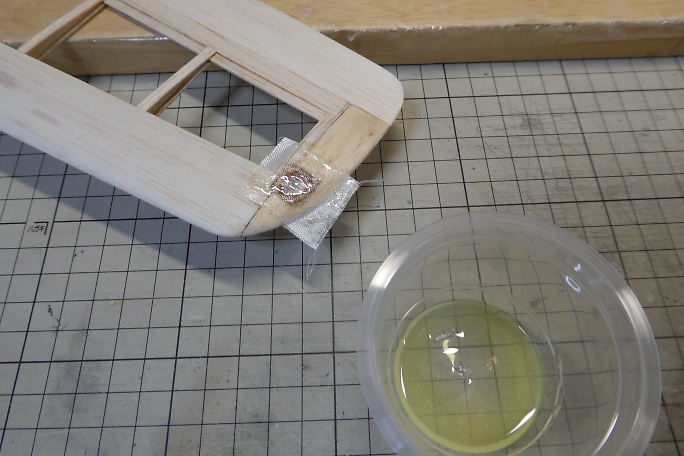 ![]() ペグ周りの補強の為に、グラスを貼り込みます。 付属のグラステープにはペグ周りの補強用に余裕が取ってあります ので、補強用に30ミリ幅でカットします。 この手の繊維を切るのにはロータリーカッターが便利です。 ![]() 3Mの77などのスプレー糊を軽く吹いて、主翼の補強部に乗せ、繊維を馴染ませます。 ![]() エポキシ樹脂で補強をします。 今回は5052を使用しますが、低粘度瞬間接着剤や5分エポキシでも代用可能です。 5分エポキシの場合は、ドライヤーなどで温めて粘度を減らし、ガラスクロスに良く含浸させる必要があります。 ![]() 樹脂を馴染ませたら、ティッシュで表面に浮いた樹脂を拭き取っておきます。 ![]() 仕上げでの手間を省くために、ラップをシワにならないようテンションを掛けて貼ります。 ![]() ラップの上から加圧して、24時間放置します。 ![]() 24時間後に加圧を解いた状態です。 ラップを貼ってあったので、表面は滑らかになっていて、仕上げに手を加える 必要はありません。 ![]() はみ出た部分をトリミングしておきます。 |