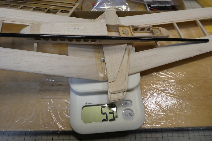 パーツ類の工作が終わったので、重量測定をしてみました。 生地完成状態で53グラムでした。 |