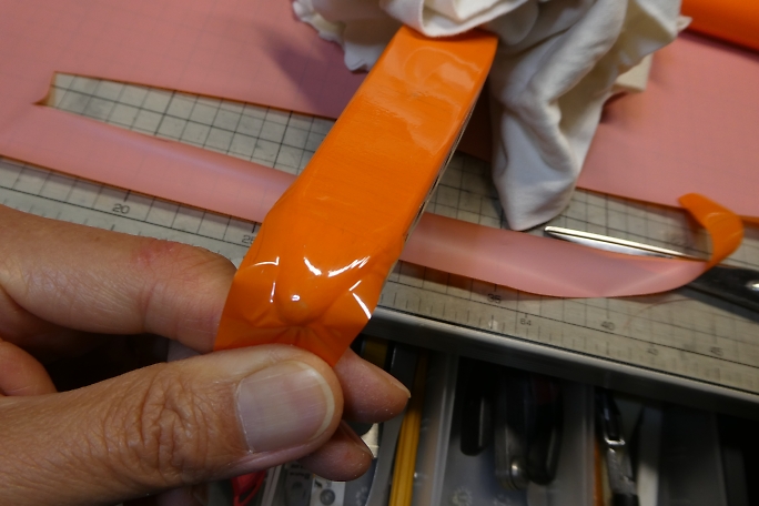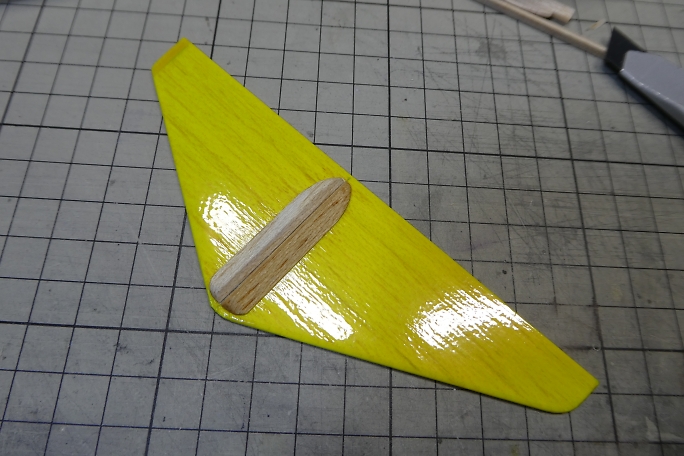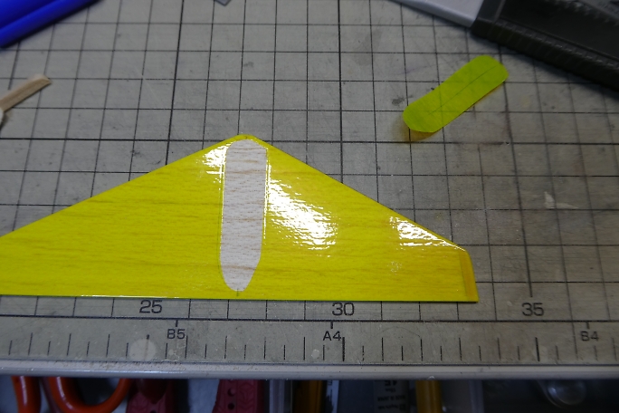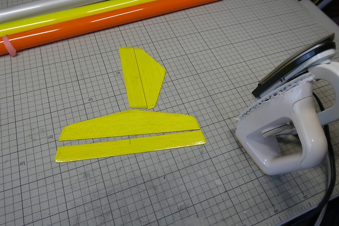 水平尾翼にパイロンを接着します。 ![]() パイロンの位置決めをしたら、パイロンの外観をマーキングして、フイルムを切り取ります。 切り取った周囲はアイロンを当てて密着を強化します。 ![]() 低粘度瞬間接着剤で接着します。 |