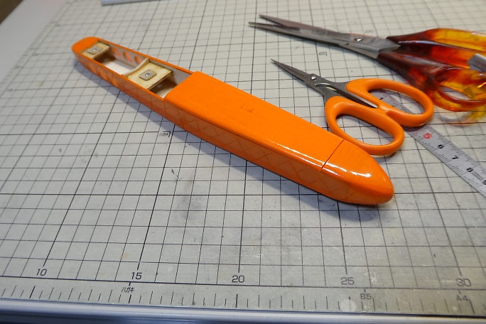 ![]() 胴体のノーズ部分も高温のアイロンでしっかり加熱してから思いっきり引っ張って馴染ませます。 ![]() 胴体が貼り終わりました。 |