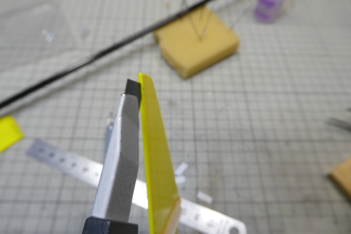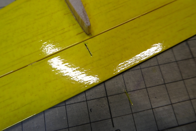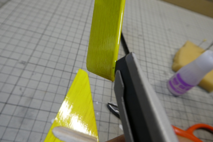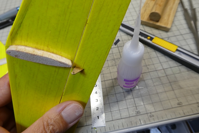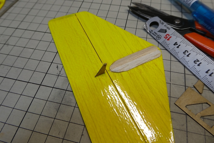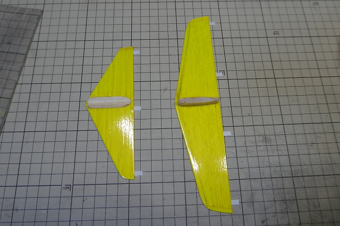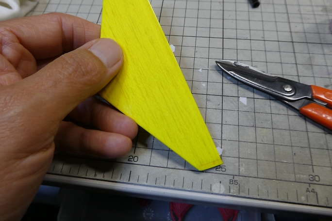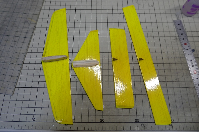 ![]() トーションバーを作ります。 付属の0.3ミリピアノ線を、30ミリ×8ミリのコの字に曲げて、そこから90°ひねって おきます。 180°曲げると強すぎる感じがありました。 運用した感じ、40ミリ×8ミリでも問題無さそうです。 尾翼の板厚が 1.5ミリなので、トーションバーのテンションに負けて捻れが出てしまう恐れがあります。 ![]() ヒンジはムサシノライトヒンジを4ミリ×10ミリのサイズで必要分切り出します。 ![]() 垂直尾翼側にカッターで切れ込みを入れます。 切れ込みを入れたら、アイロンで軽く押さえてフイルムの浮きを防止 しておきます。 ![]() ![]() ヒンジの片側の隅をカットして、差し込みやすくします。 差し込む長さは約4ミリです。 差し込んだら、低粘度瞬間接着剤を流して接着します。 ![]() 作業がしやすいように残しておいた反対側の角も差し込みやすいようにカットしておきます。 カット後の長さを4ミリ とします。 ![]() ラダー側にもカッターで切り込みを入れます。 こちらも切れ込み部分アイロンで押さえておきます。 ![]() 組み合わせて動きを確認します。 ヒンジラインがずれていると「パコッパコッ」とした動きになります。 ![]() ラダーホーンを角度に注意して低粘度瞬間接着剤で接着します。 ![]() エレベーターホーンの取り付けスロットのフイルムを、取り付け面のみ切り取り、周囲をアイロンで押さえて置きます。 ![]() エレベーターホーンを角度に気を付けて低粘度瞬間接着剤で接着します。 ![]() 尾翼が揃いました。 |