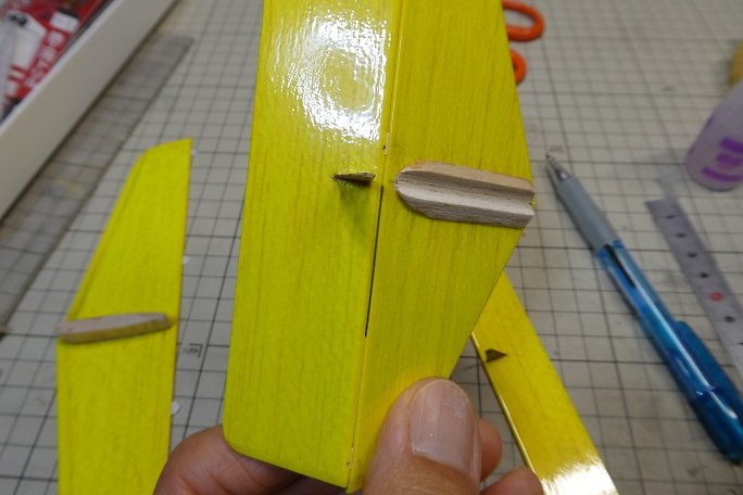 トーションバーを仕込んで、動翼のヒンジを差し込んで、低粘度瞬間接着剤をごく少量、ヒンジ部に流してヒンジを接着します。 コピー用紙を細く切った物を用意して、動翼との隙間に回り込んだ低粘度瞬間接着剤を吸い取っておきます。 そのままにすると、フイルム同士が接着されて、動きが悪くなってしまいます。 |