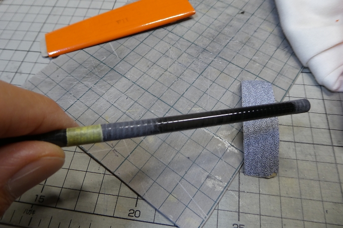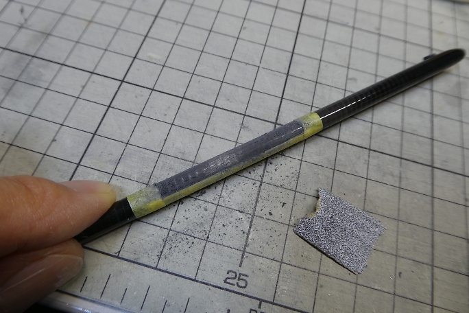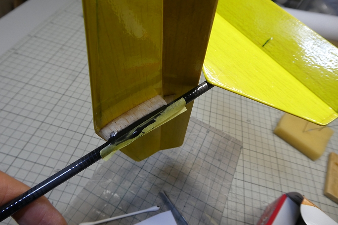 ![]() パイロンとカーボンパイプの隙間をカーボンパウダー入り5分エポキシで埋めます。 マスキングテープで養生をして隙間に カーボンパウダー入り5分エポキシを充填します。 ![]() 充填が終わったら、マスキングテープは直ぐに剥がしておきます。 |