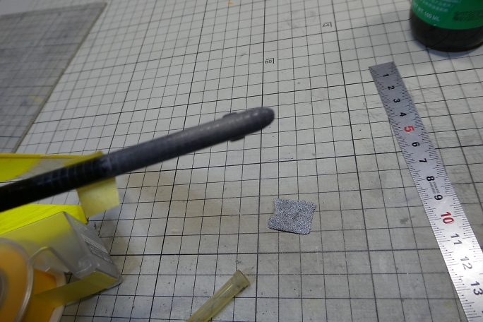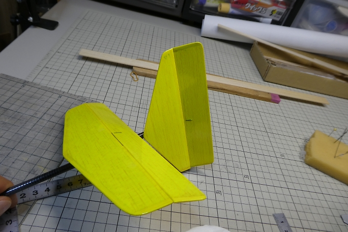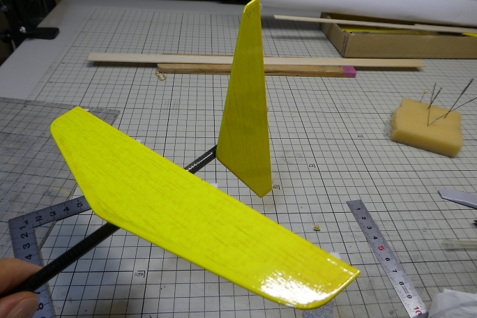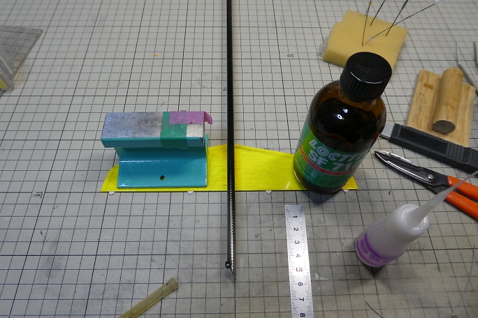 ![]() カーボンパイプの水平尾翼を取り付ける部分をマスキングテープで養生をしてサンディングをして足付けをしておきます。 ![]() デスクマットの方眼を使って直角出しをして、水平尾翼面とカーボンパイプが平行になるように調整をしてパイロンと カーボンパイプを低粘度瞬間接着剤で接着します。 この段階では、とりあえず動かなければ良いので、最小量の接着剤で充分です。 接着剤が硬化をしたら、向きを変えて接着剤を流しやすい体勢で本接着を行います。 |