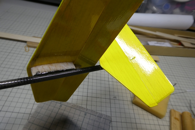 ポッドに主翼を取り付けて、主翼の左右の翼端に貼った水糸と水平尾翼のアライメントを合わせて、ポッドとカーボンパイプ を低粘度瞬間接着剤で接着します。 |