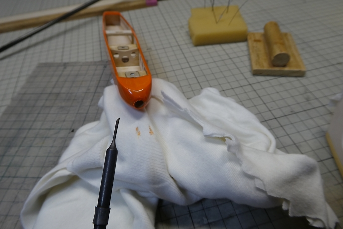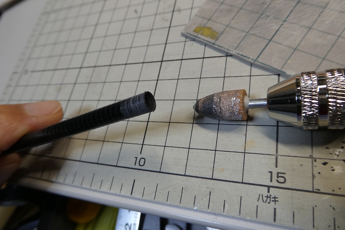 ![]() ポッドのカーボンパイプを差し込む部分のフイルムをハンダゴテで溶かして取り除きます。 カーボンパイプをポッドに差し込んで、位置決めが出来たら、カーボンパイプにマスキングテープでマーキングをしておきます。 また、接着する部分もサインペンでマーキングをしておきます。 ![]() マーキングを元に、カーボンパイプの接着部をサンディングして、足付けをしておきます。 ![]() リンケージラインが傷つかない様に、カーボンパイプの切り口の角をリューターで削って滑らかにしておきます。 |