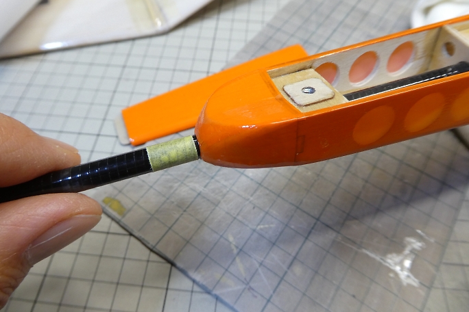 垂直尾翼の取り付け部のカーボンパイプをマスキングテープで養生をしてサンディングをして足付けをしておきます。 ![]() エレベーターを取り付けるスペースを意識して、水平尾翼と直角になるように垂直尾翼を低粘度瞬間接着剤で接着します。 |