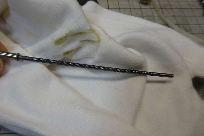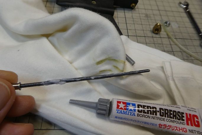 ![]() とりあえず分解してみました。 真鍮製のロックナットは逆ネジ仕様です。 ロックナットを外すとシャフトが引き抜けます。 ワイヤーシャフトにテフロンチューブが被っています。 ![]() シャフトには古いグリスが塗布されていたので、拭き取ってパーツクリーナーで洗浄しました。 タミヤのセラグリスを塗布して組み直します。 |