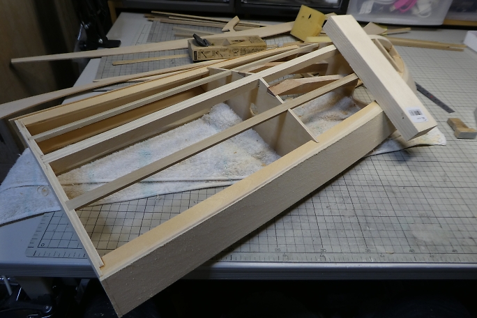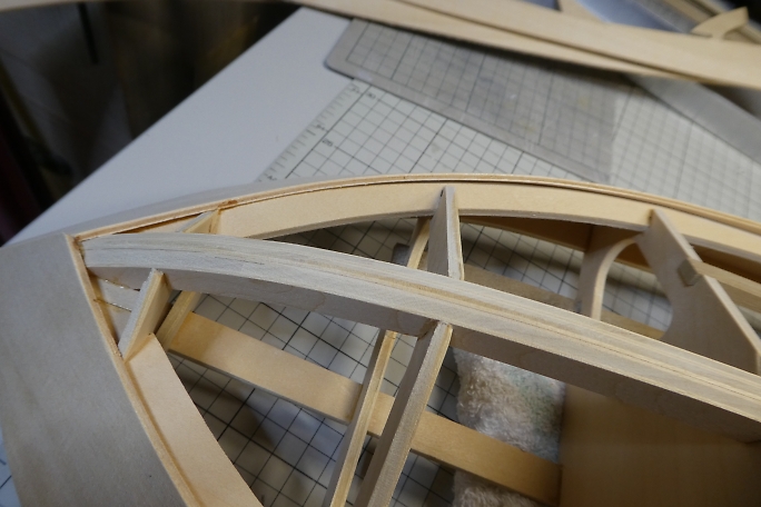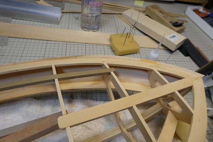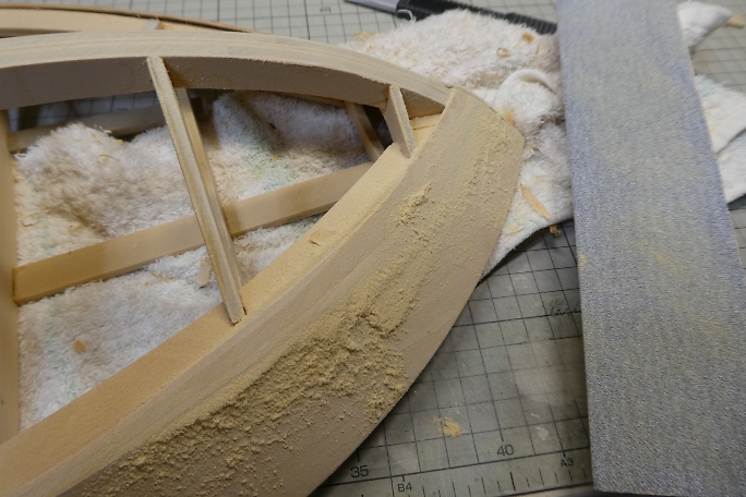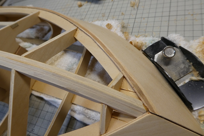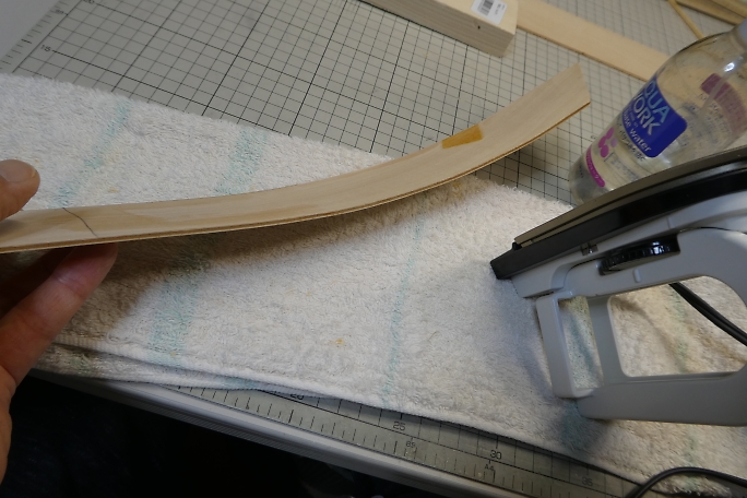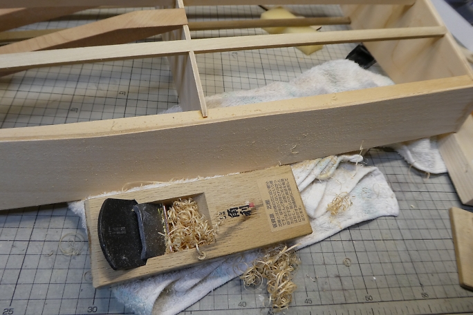 ![]() 外板は側面板から貼って行きます。 図面の指示がこちらからですが、キットによっては船底を先に貼る物もあります。 事前に曲げ癖を付けておきます。 外板に霧吹きでたっぷりと水を掛けて、高温にセットしたアイロンで加熱しながら扱く様に曲げて行きます。 ベニヤの板厚が2.5ミリと厚い上に、ベニヤ自体が古くなっていたので、なかなか曲がってくれませんでした。 ![]() 先端の合わせ部分を予め削っておきます。 最後に隙間部分は埋めたり貼ったりして修正しますが、出来るだけ修正 を少なくしたいためです。 ![]() 外板材の大きさはかなりアバウトで、はみ出しは気にせず貼って行きます。 前側を合わせて、船内から中粘度瞬間 接着剤を流しながら、少しずつ貼って行きます。 ![]() 大きさがアバウトと言っておきながら、後端が3ミリほど長さが足りませんでした。 ![]() 幸い、ダイカットのランナー部分が大量にあるので、そこから部材を切り出して宛がいました。 ![]() 左右の側面外板が貼り終わりました。 盛大にはみ出している部分の修正をしないといけません。 ![]() フレームの傾きに合わせて削って行きます。 小カンナで荒削りをします。 ![]() 曲面部分は小さいホビーカンナが便利です。 ![]() 120番のサンディングブロックで、船底外板を貼ることをイメージしながら削っていきます。 ![]() 側面外板の端面はフレームをガイドにして傾斜を合わせます。 ![]() スケールを当ててフレームと整合が取れているか、傾きのチェックをします。 |