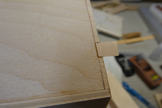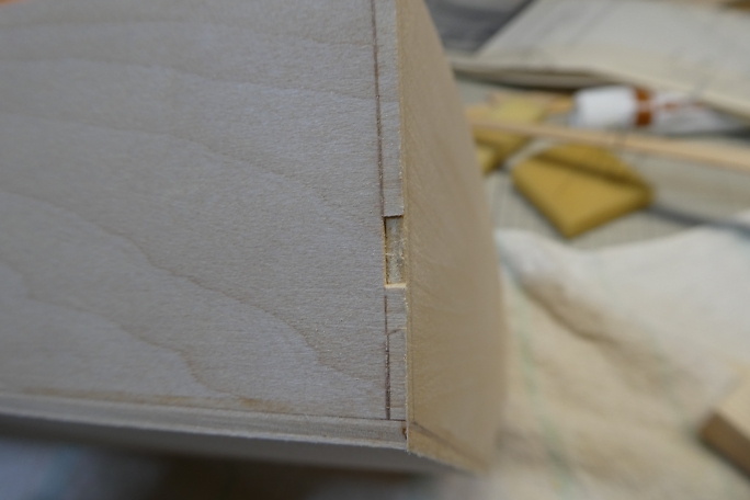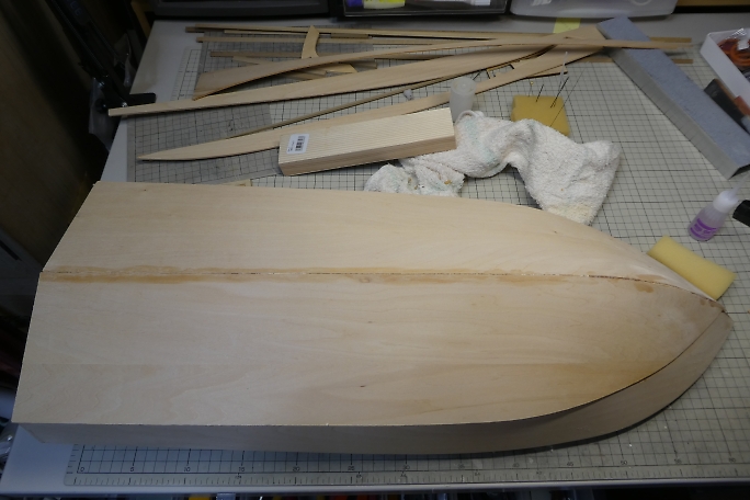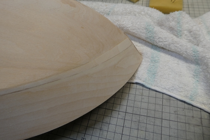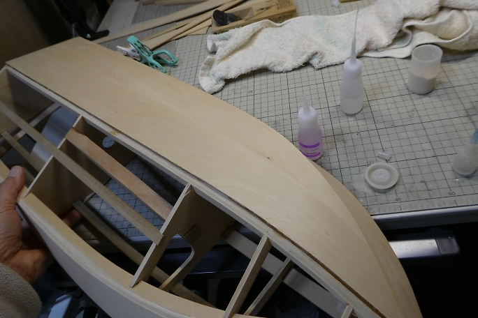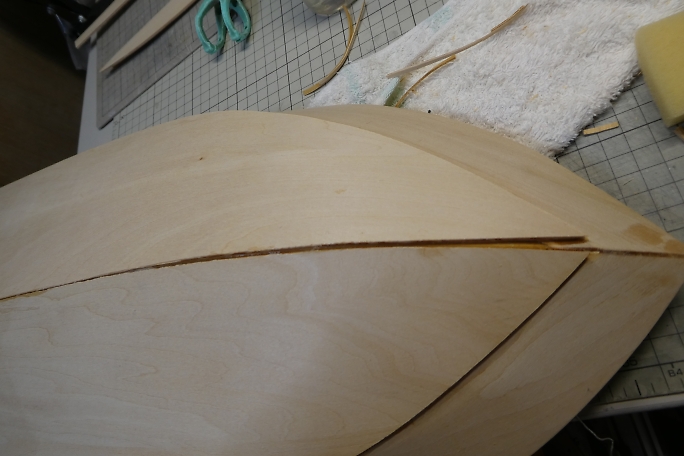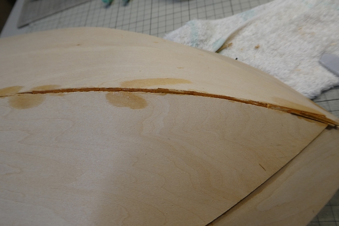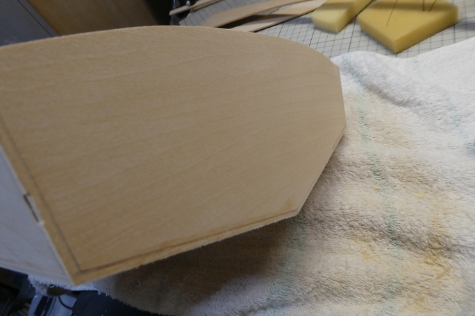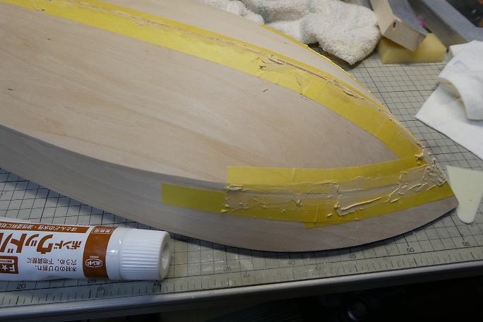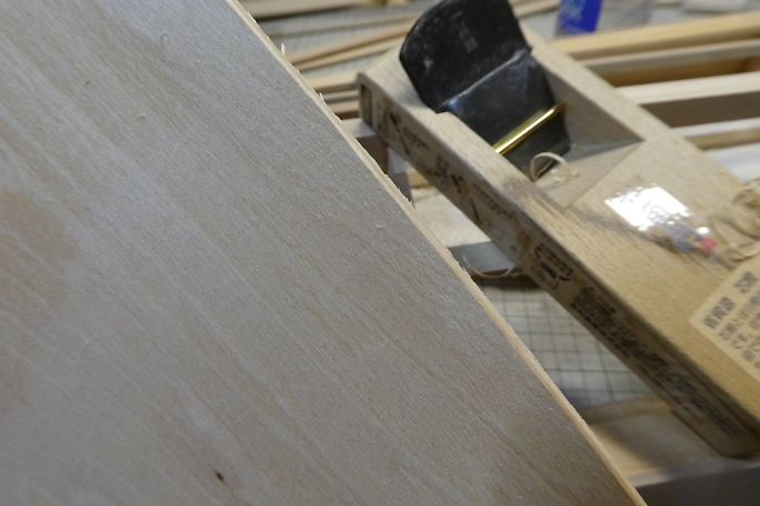 ![]() 側面外板と同様、水で湿らせてから高温のアイロンで加熱しながら、扱くようにして曲げ癖を付けていきます。 ベニヤが厚いのと、古くなっているので中々曲がってくれませんでした。 片側は内側の表皮材にヒビが入ってしまいました。 ![]() 中央の合わせ目になる部分は、カンナで予め角度が付く様に削っておきます。 ![]() 側面外板の長さが足りなかったので、覚悟はしていましたが、先端部分で幅が足りませんでした。 どちらに寄せても 足りない場所が出てしまいます。 手持ちのシナベニヤは600ミリサイズで、長さが足りないので、このまま続行する ことにしました。 ![]() 片側が貼り終わりました。 接着には中粘度瞬間接着剤を使用し、外板を位置決めして押さえた所に、船内から隙間に 流して接着します。 ![]() 左右が貼り終わりましたが、この様に隙間が出来てしまいました。 ![]() 船首部分はベニヤの破片を作って差し込み、低粘度瞬間接着剤で固めて隙間を大まかに埋めます。 ![]() はみ出た部分を整形して見ました。 大体埋まったので、後はパテで帳尻を合わせます。 ![]() 船底の合わせ目全体、スクラップベニヤ+低粘度瞬間接着剤戦法で埋めていきます。 ![]() 船首部分の側面板と船底板の合わせ目を整形します。 はみ出た部分をカンナで荒削りしていきます。 ![]() 削って見た所、一枚張りの限界か、合わせ目部分に隙間が出来てしまっています。 ![]() 隙間部分にはウッドパテを盛って整形する事にしました。 マスキングテープで養生をしてウッドパテを盛りました。 ![]() 二日間乾燥させてから整形します。 しっかりと削り込んで仕上げます。 ![]() トランサム部分も船底板のはみ出しを整形します。 ![]() 整形が完了です。 ![]() サンディングブロックが引っかかってもツギハギした所のベニヤが一部剥がれてしまいました。 古いベニヤの弊害です。 ![]() スクラップベニアの外側を剥がして、中粘度瞬間接着剤で接着しました。 ![]() 目が縦横になってしまいましたが、整形して修復完了です。 |