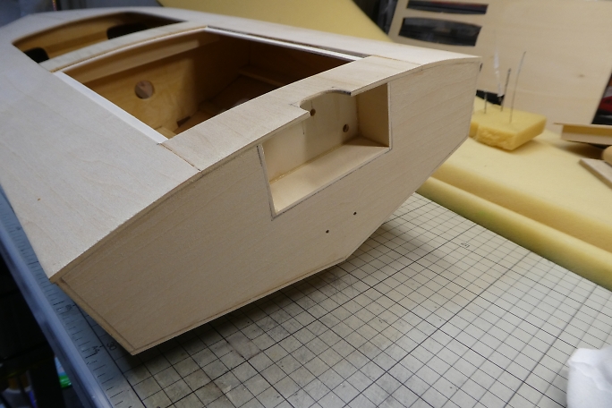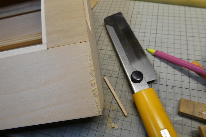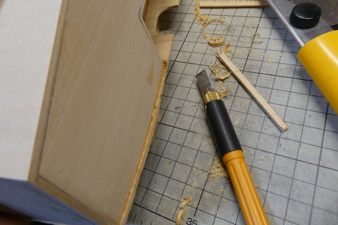 トランサム周りのはみ出している甲板材を切り取ります。 大きな張り出しはレーザーソーで切り取ります。 ![]() カンナを掛けても良かったのですが、手の届く所にあった、オルファの平刃で削り取ります。 非常に良く切れます。 ![]() 軽くサンディングをして仕上げておきます。 |