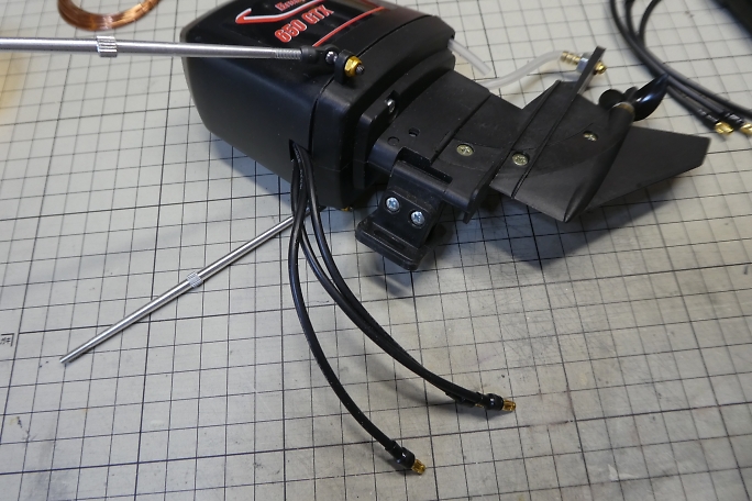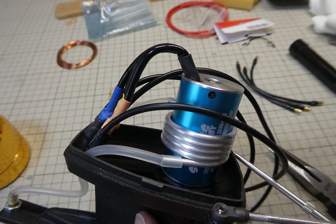 モーターにコードを取り付けて、船外機内で取り回します。 ![]() カバーを閉めてコードを取り出します。 |