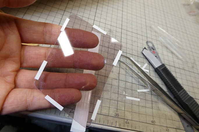 ![]() キャビンにアクリル板を取り付ける為に両面テープを細く切ります。 ![]() 半分だけ貼り付け、裏紙を剥がしながらテープを折り返して断面に両面テープが来る様にします。 はめ込むようにアクリル板を取り付けます。 |