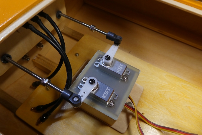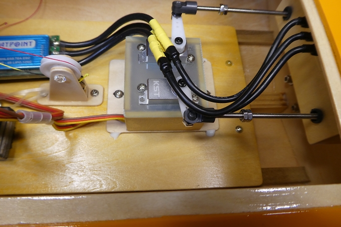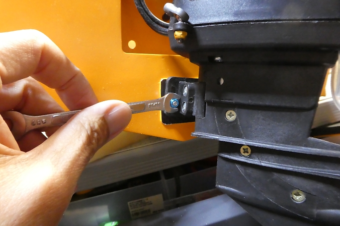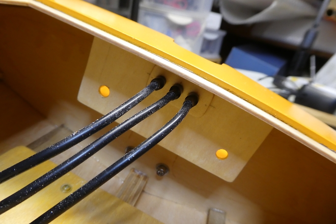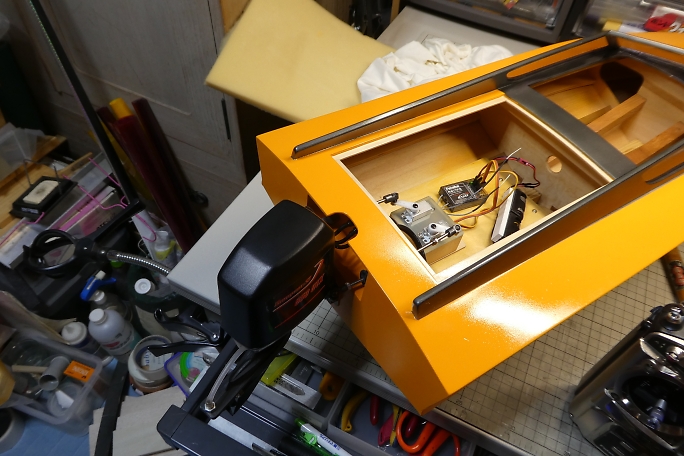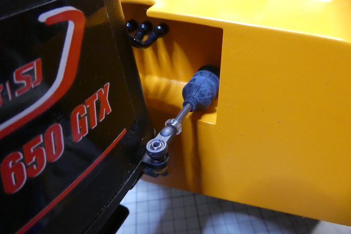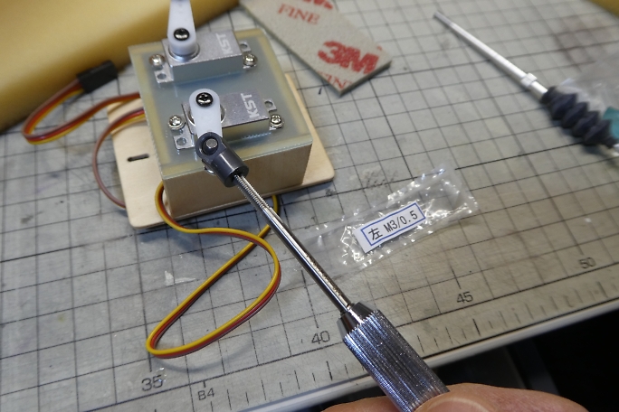 モーターを取り付け、アルミロックナットで締め付けます。 キャビテーションボードと船底の一番高い所を合わせました。 ![]() ![]() ロッドエンドにはM3のタップで予めネジを切っておきます。 ![]() 本当はアルミターンバックルを使う予定で、入手済みでしたが、予想外に太くて使用を断念、M3のSUS寸切りボルト を使う事にしました。 ツマミ代わりにダブルナットを取り付けてあります。 ![]() 船外機側です。 防水ブーツを取り付け、回り止めにポリカナットを取り付けてあります。 ![]() 船内側です。 ![]() 動作確認をしておきました。 ![]() 試走後にチルト角が決まってサーボ位置が確定したので、サーボベッドとメカベースをマイクロバルーン入り5分エポキシ を点付けして固定しました。 |
