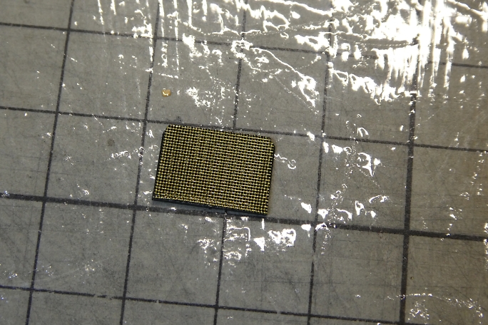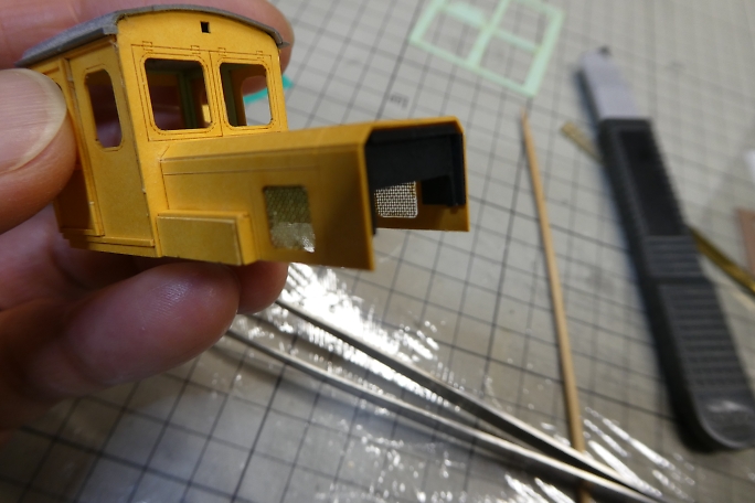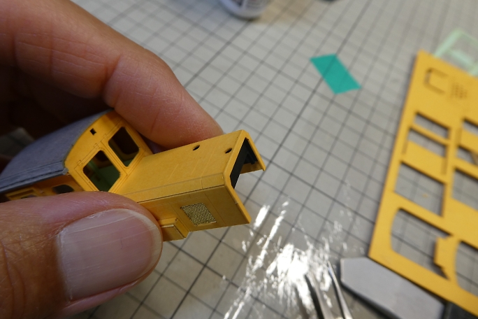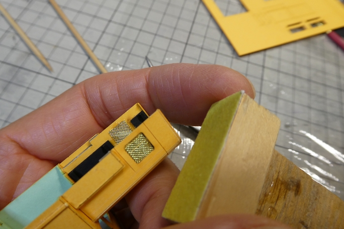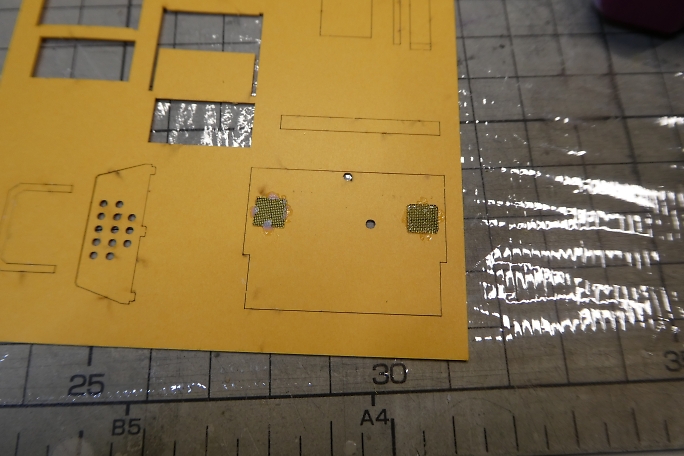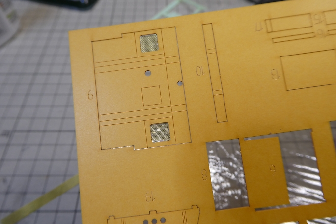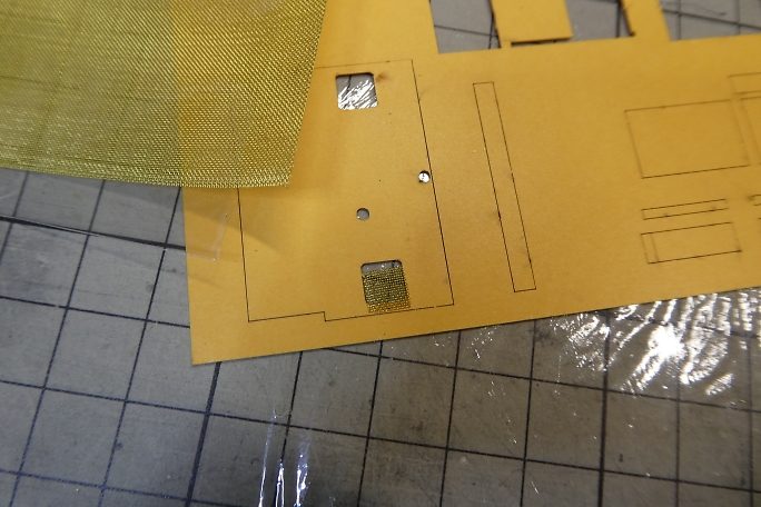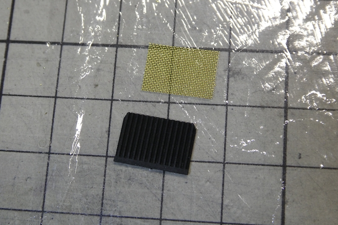 ボンネットにあるラジエター部分は、凹凸加工のされた厚紙を裏から接着するのが設計の仕様ですが、ここにリアル感を 出すために目の細かい真鍮メッシュを使用します。 ![]() ボンネットパーツの裏側から、カットした真鍮メッシュを接着剤で押さえる様に付属の接着剤で接着します。 ![]() 表から見るとこんな感じになります。 |