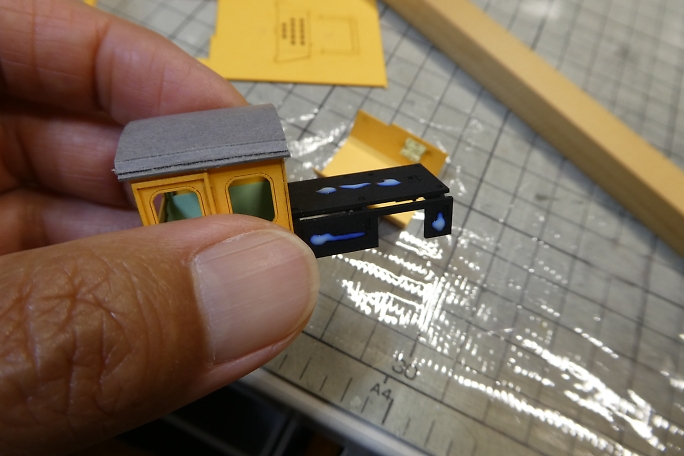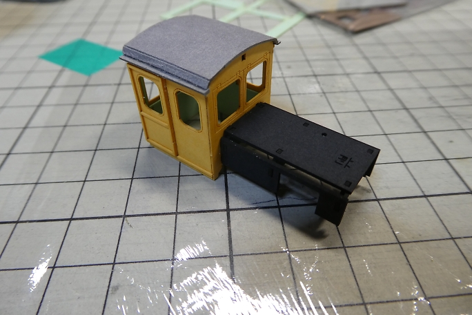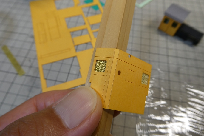 ![]() キャビンに、ボンネットのフレームになるパーツを接着します。 このパーツはキャビンなどより厚手の紙が使用されて います。 ![]() ボンネットパーツは1枚物なので、折り目を付けて箱形にします。 角材の角を利用して、キッチリと折り目を付けます。 ![]() ボンネットパーツを接着します。 付属の接着剤を使用します。 黒い紙は接着剤が染みこむのが速いので、少し多め に塗布しています。 ![]() サイドボックスを接着して、形になってきました。 |
